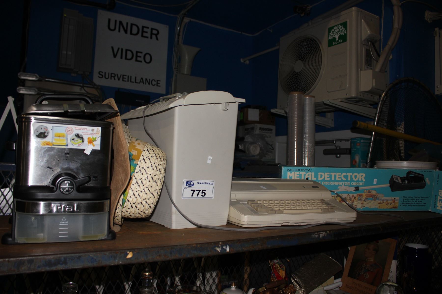 SHELF INCLUDING METAL DETECTOR, T-FAL FRYER, SHREDDER, TYPEWRITER AND MORE