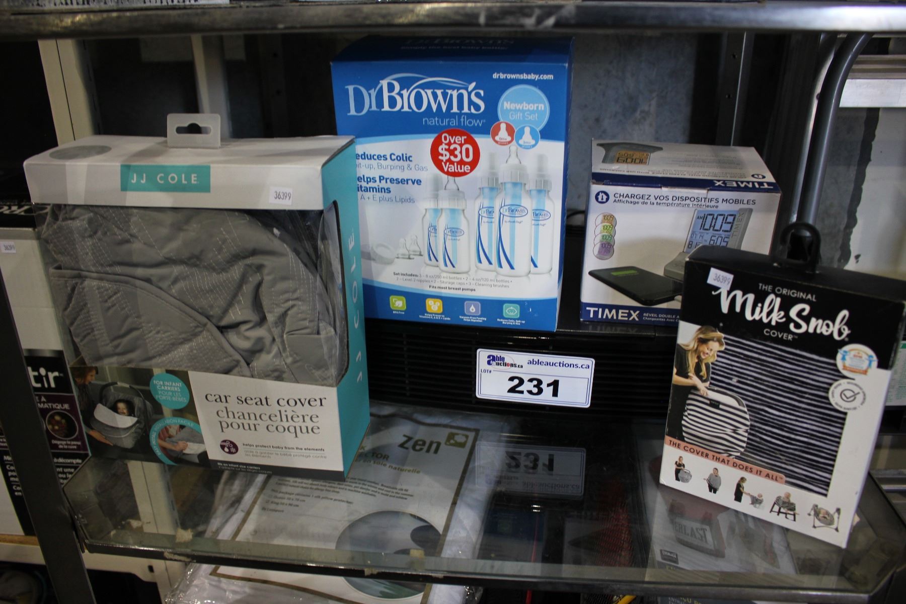 SHELF INCLUDING ORECK WINDOW FAN, JJ COLE CAR SEAT COVER, DR BROWNS BABY BOTTLE SET AND MORE