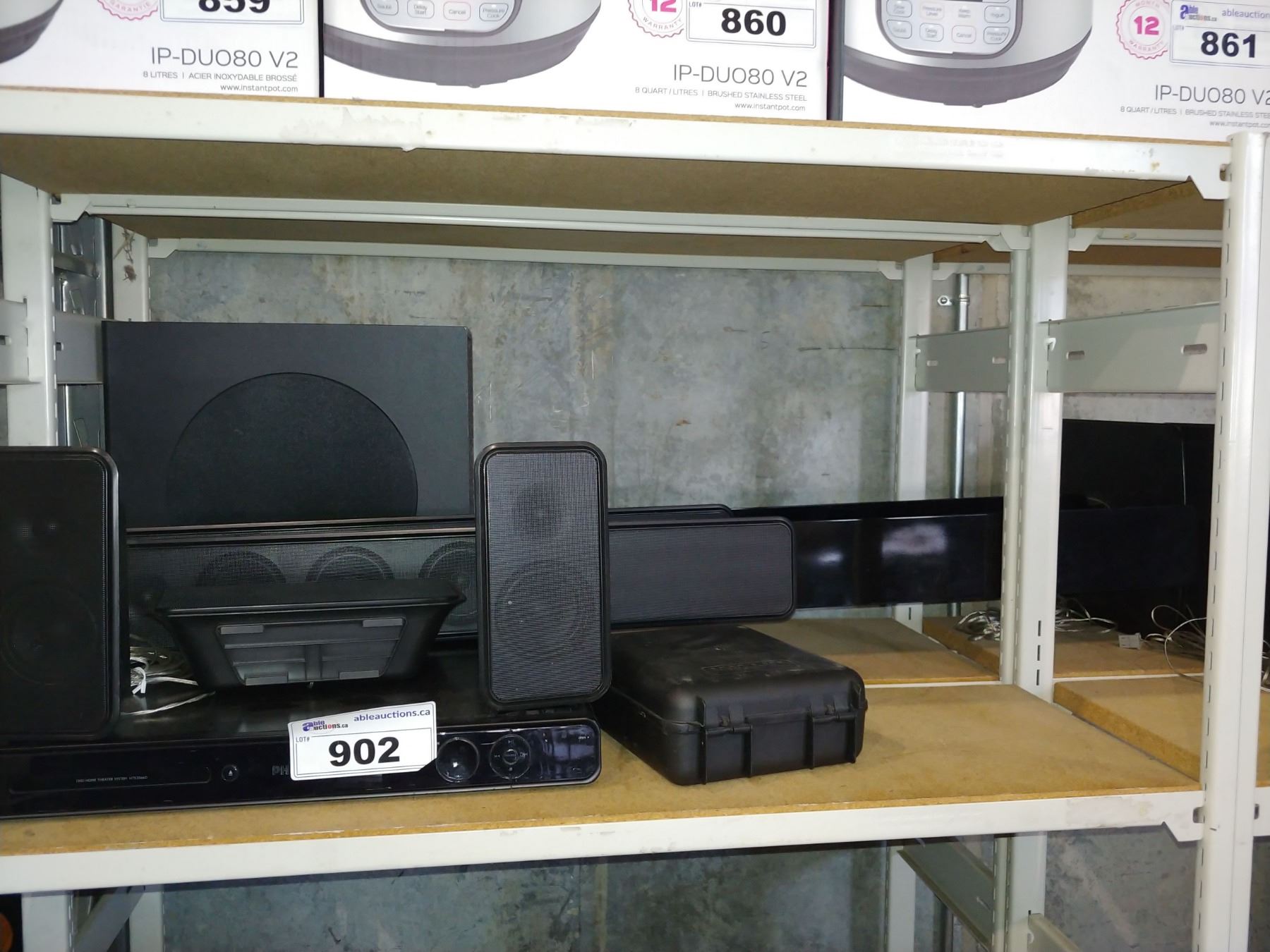 SHELF INCLUDING PHILIPS SOUND SYSTEM, TOWER SPEAKERS, WAHL SHAVER AND MORE