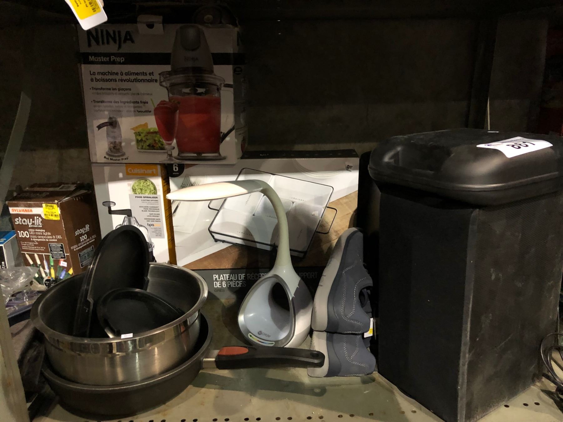 SHELF INCLUDING PRESTO AIRDADDY, SPEAKER, FOOD SPIRALIZER, LED LAMP, AND MORE