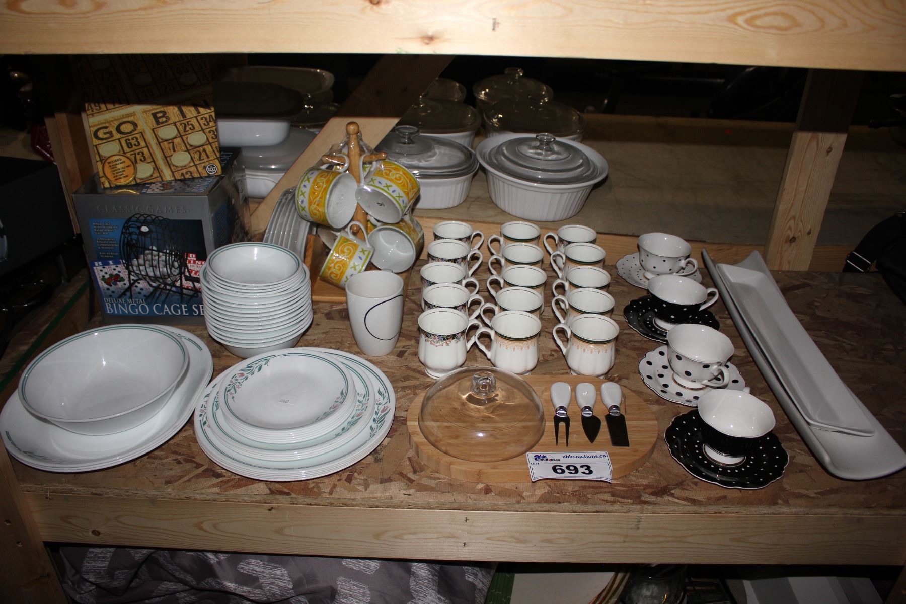 SHELF INCLUDING TEA CUPS, DISHWARE, BINGO CAGE AND MORE