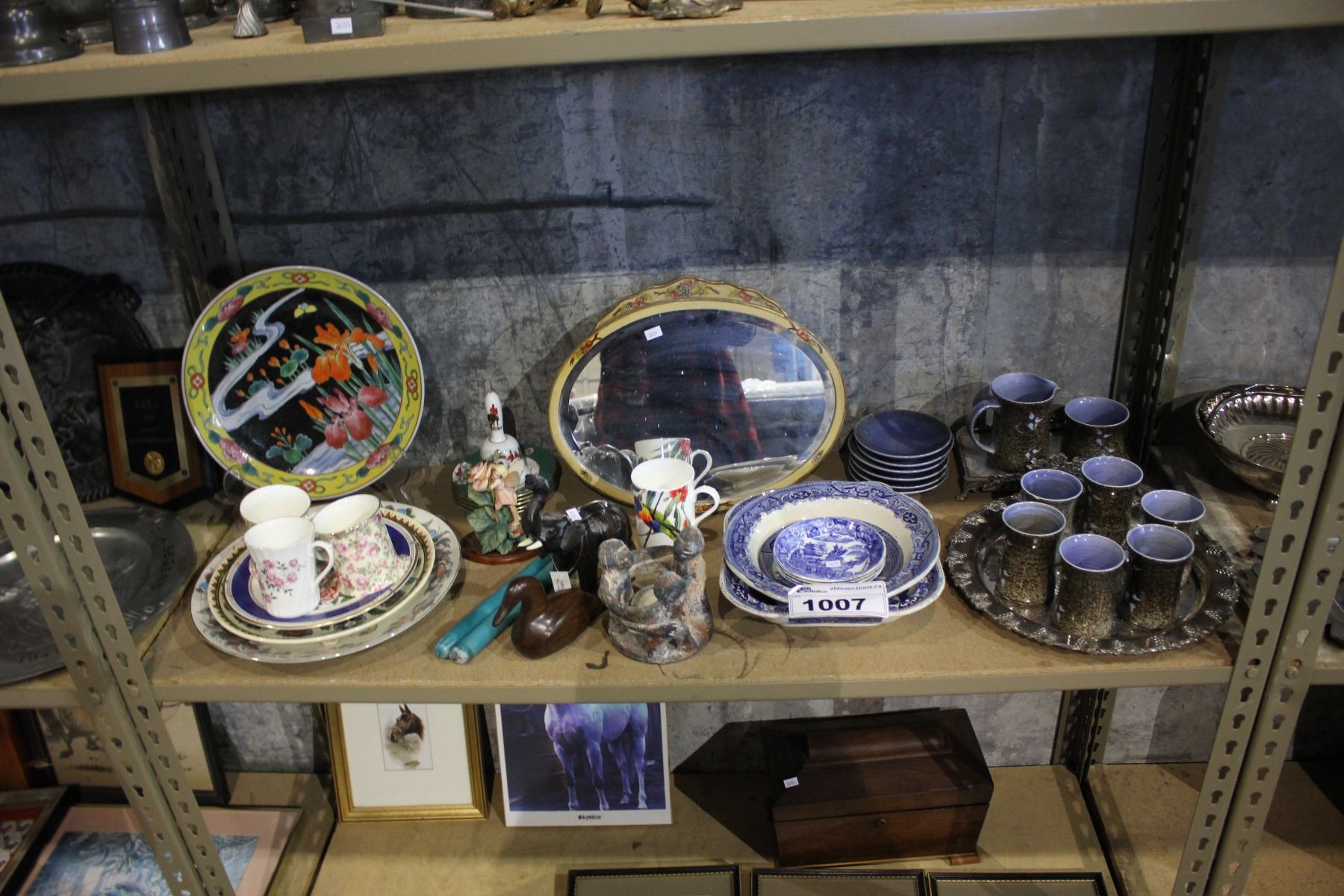 SHELF INCLUDING TEA SET, CHINAWARE, FIGURES, MIRROR, AND MORE