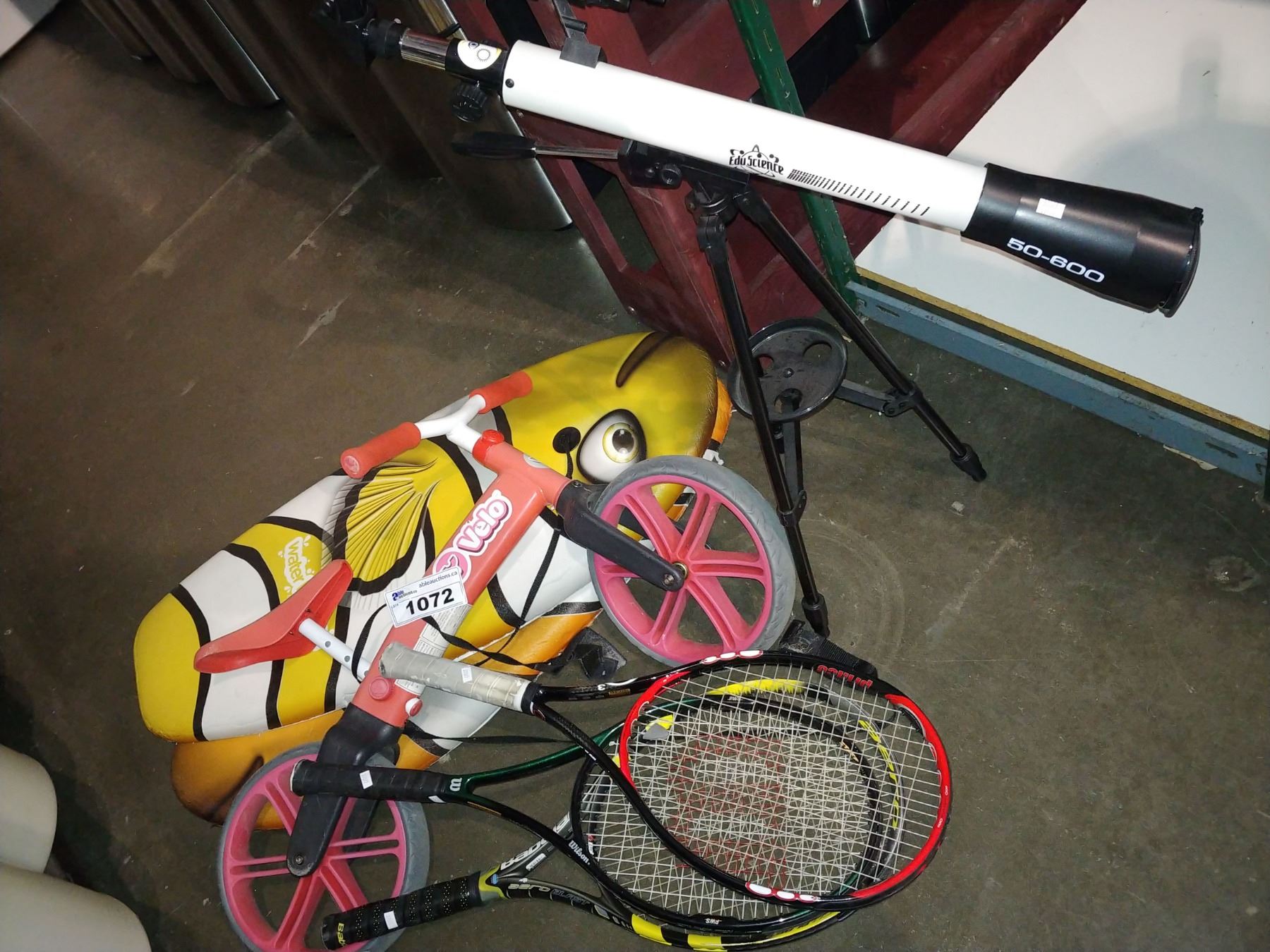 SHELF INCLUDING TELESCOPE, BIKE, TENNIS RACKETS AND PAIR OF BOOGIE BOARDS