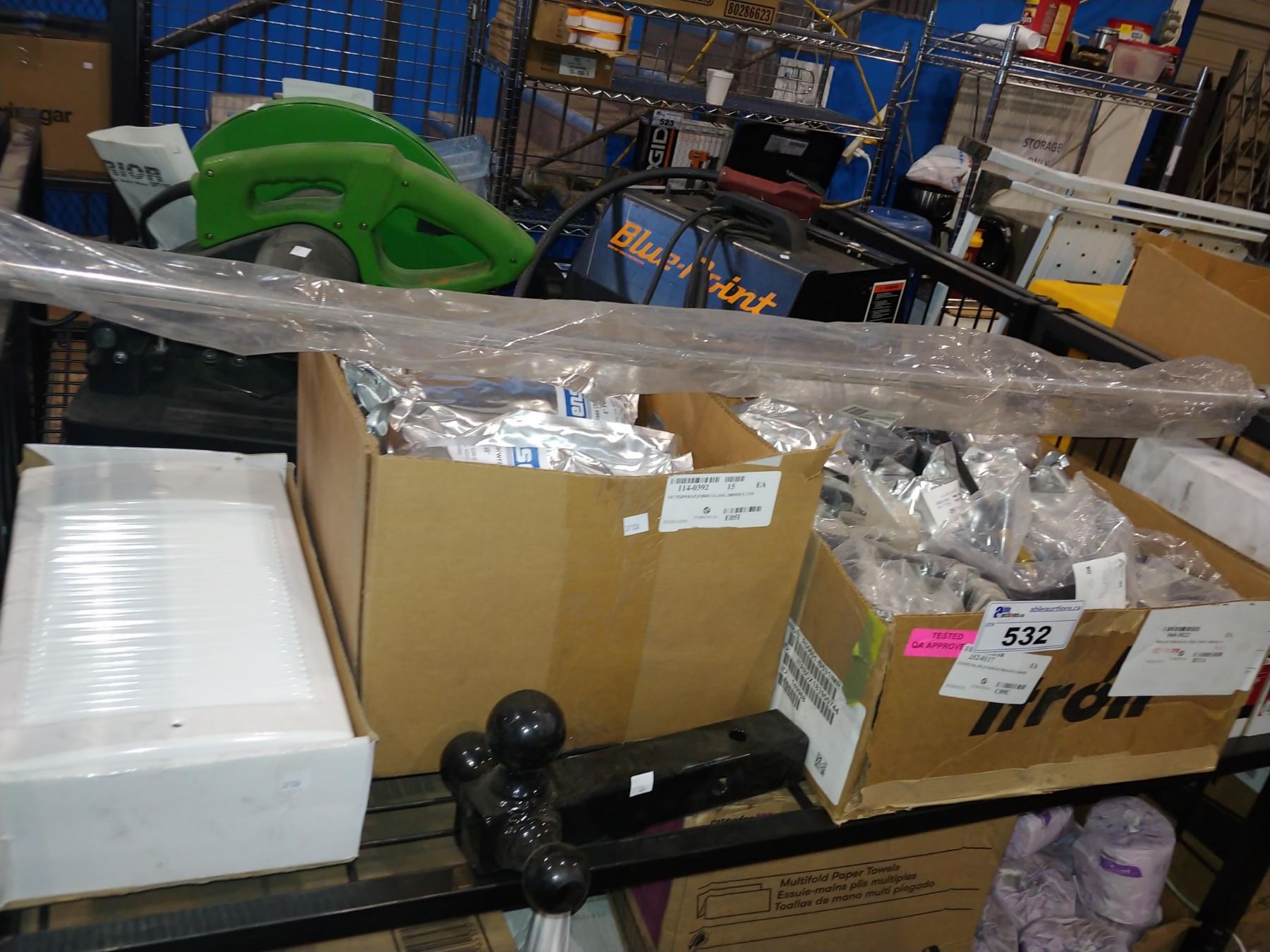 SHELF INCLUDING TRAILER HITCH, SCREWS, PIPES AND MORE ASSORTED HARDWARE