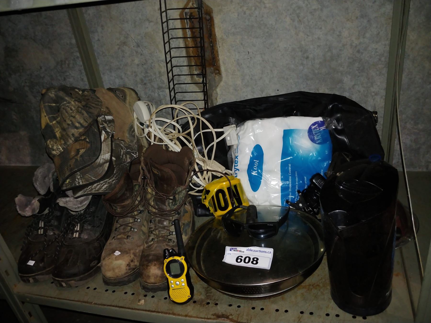 SHELF INCLUDING WORK BOOTS, BAG, KETTLE AND MUCH MORE