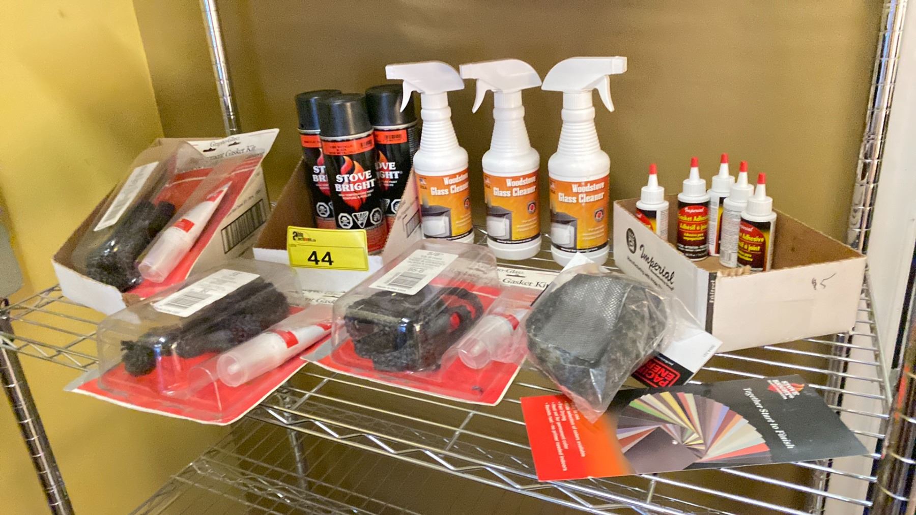SHELF LOT 3 CANS STOVE PAINT, GLASS CLEANER, STOVE GASKET, ETC.