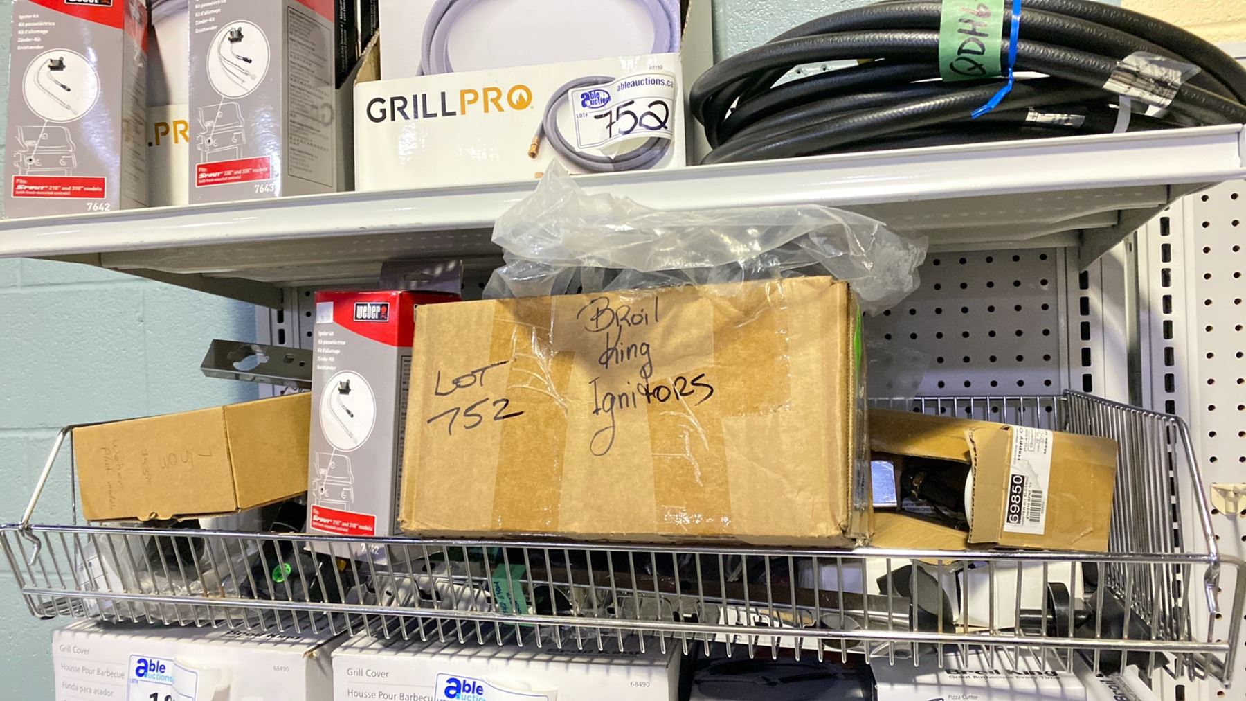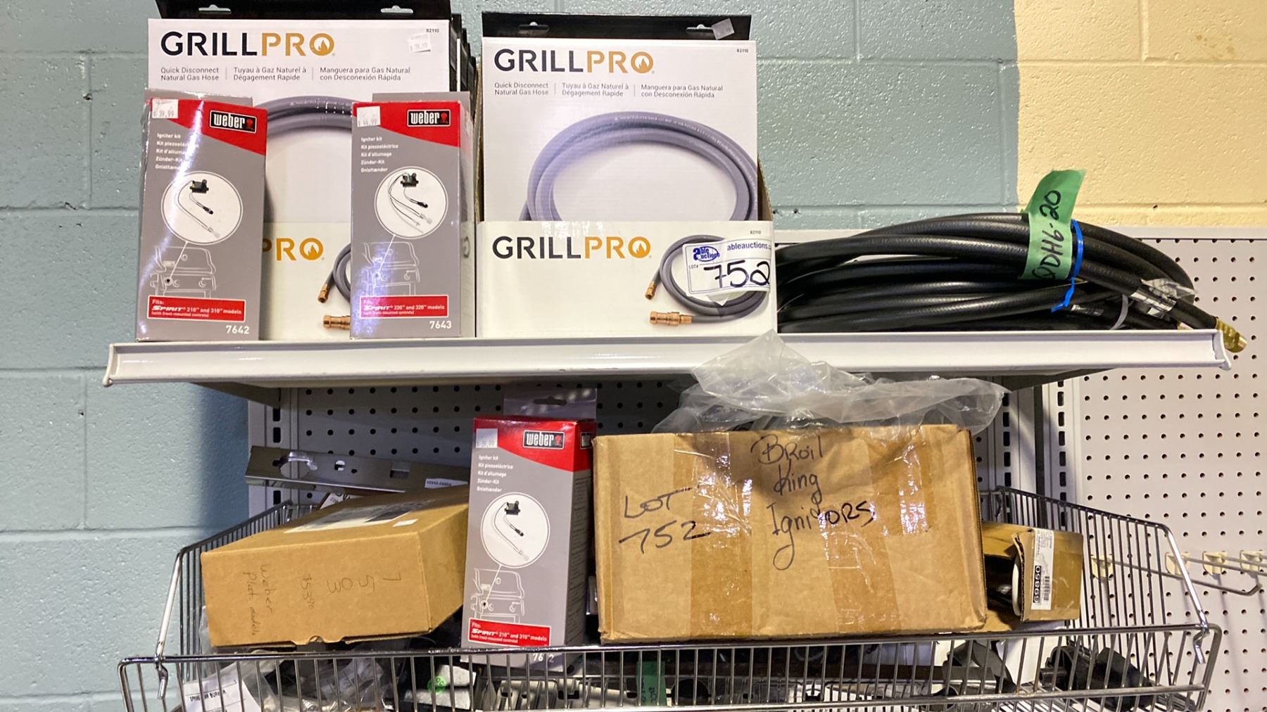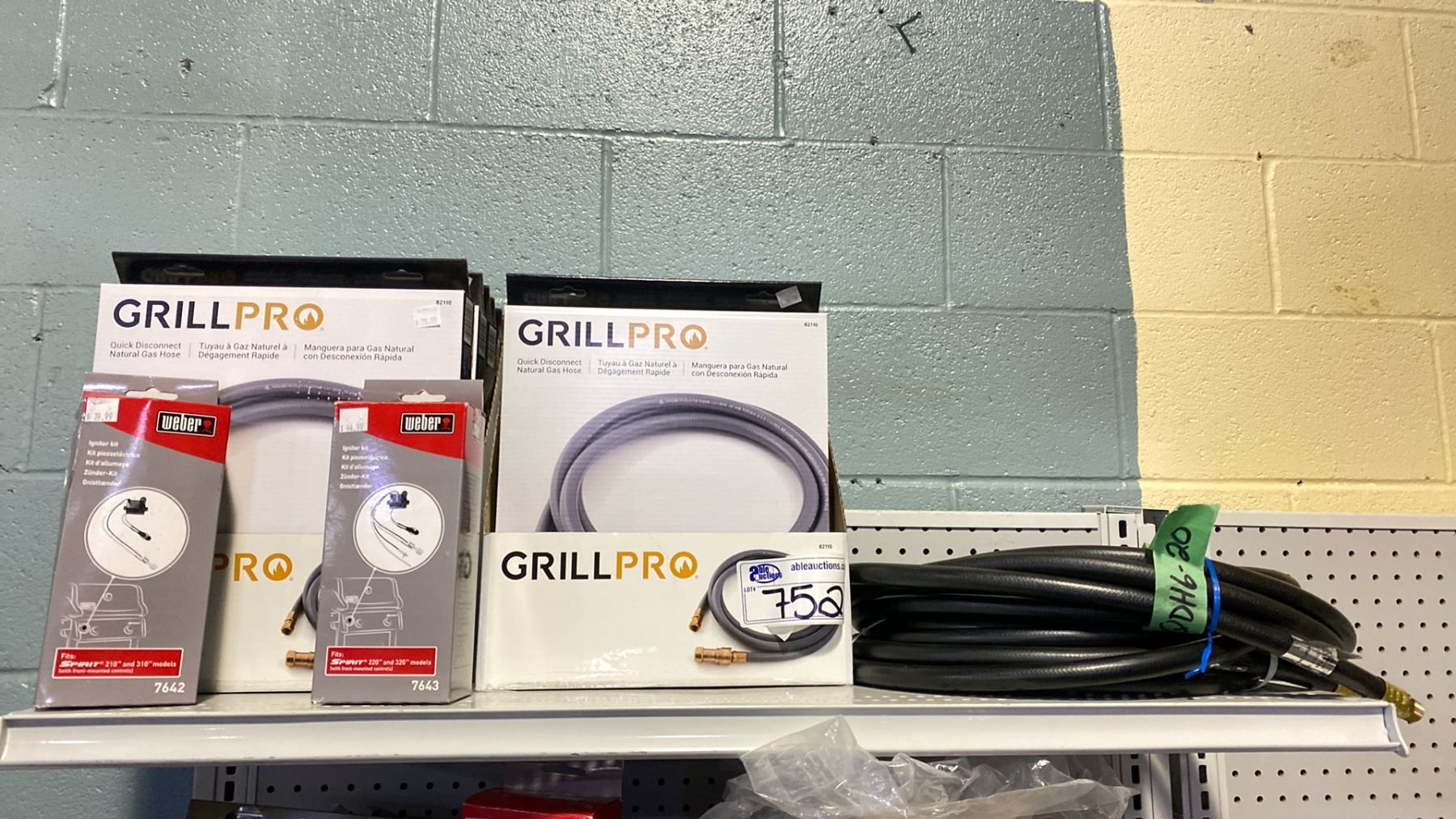 SHELF LOT APPROX 11 GRILL PRO QUICK DISCONNECT HOSES, BBQ IGNITORS, OTHER HOSES, PARTS, ETC