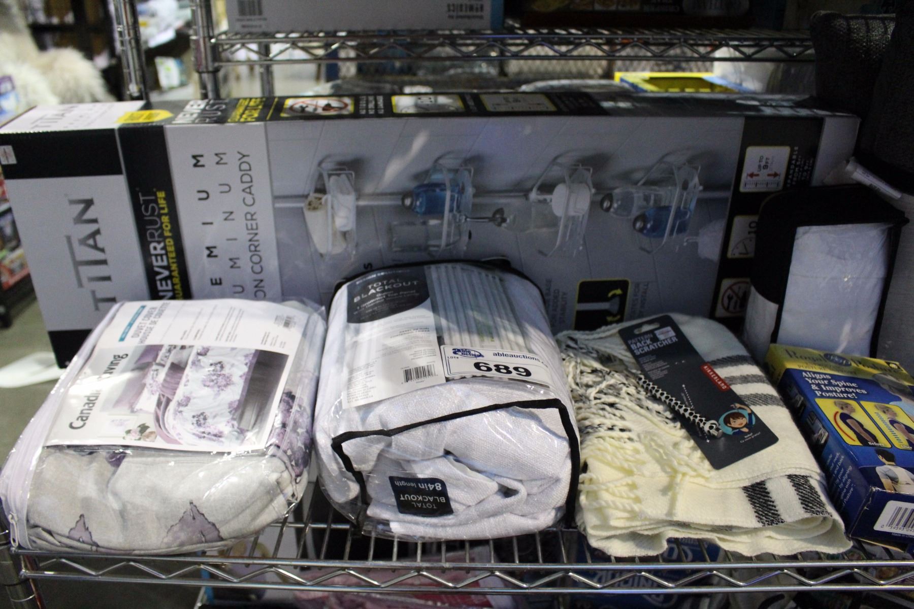 SHELF LOT - ENERGIZING POSTURE SUPPORT GARMENT, SHOWER ORGANIZER, MISC CURTAINS AND LINEN