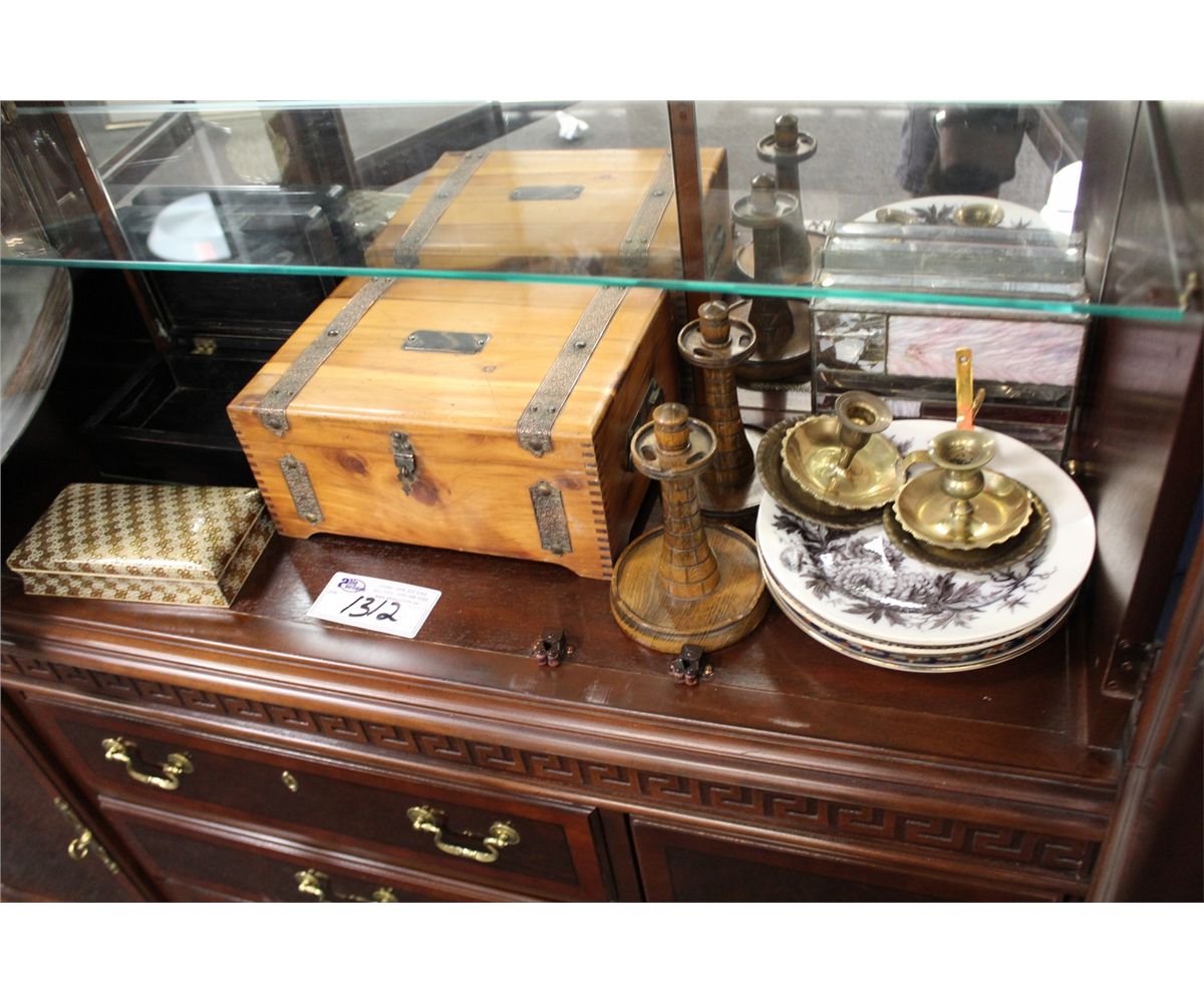 SHELF LOT FEATURING 3 JEWELLERY BOXES, CANDLE HOLDERS AND MORE