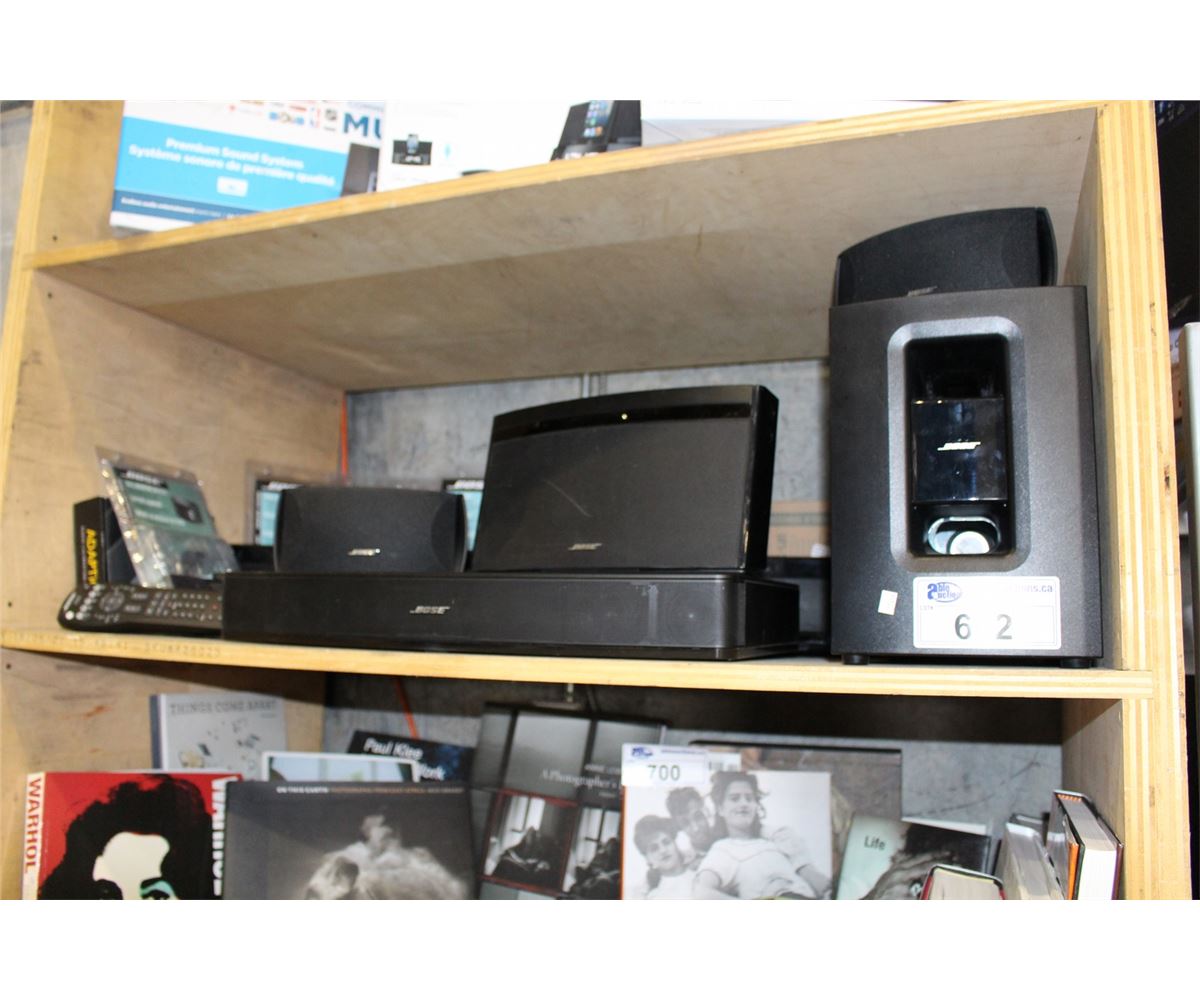 SHELF LOT FILLED WITH ASSORTED BOSE HOME AUDIO SPEAKERS, TABLE STANDS, AND MOUNTS
