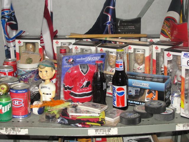 SHELF LOT FILLED WITH ASSORTED SPORTS COLLECTABLES; BOBBLE HEADS, PUCKS, FLAGS ETC