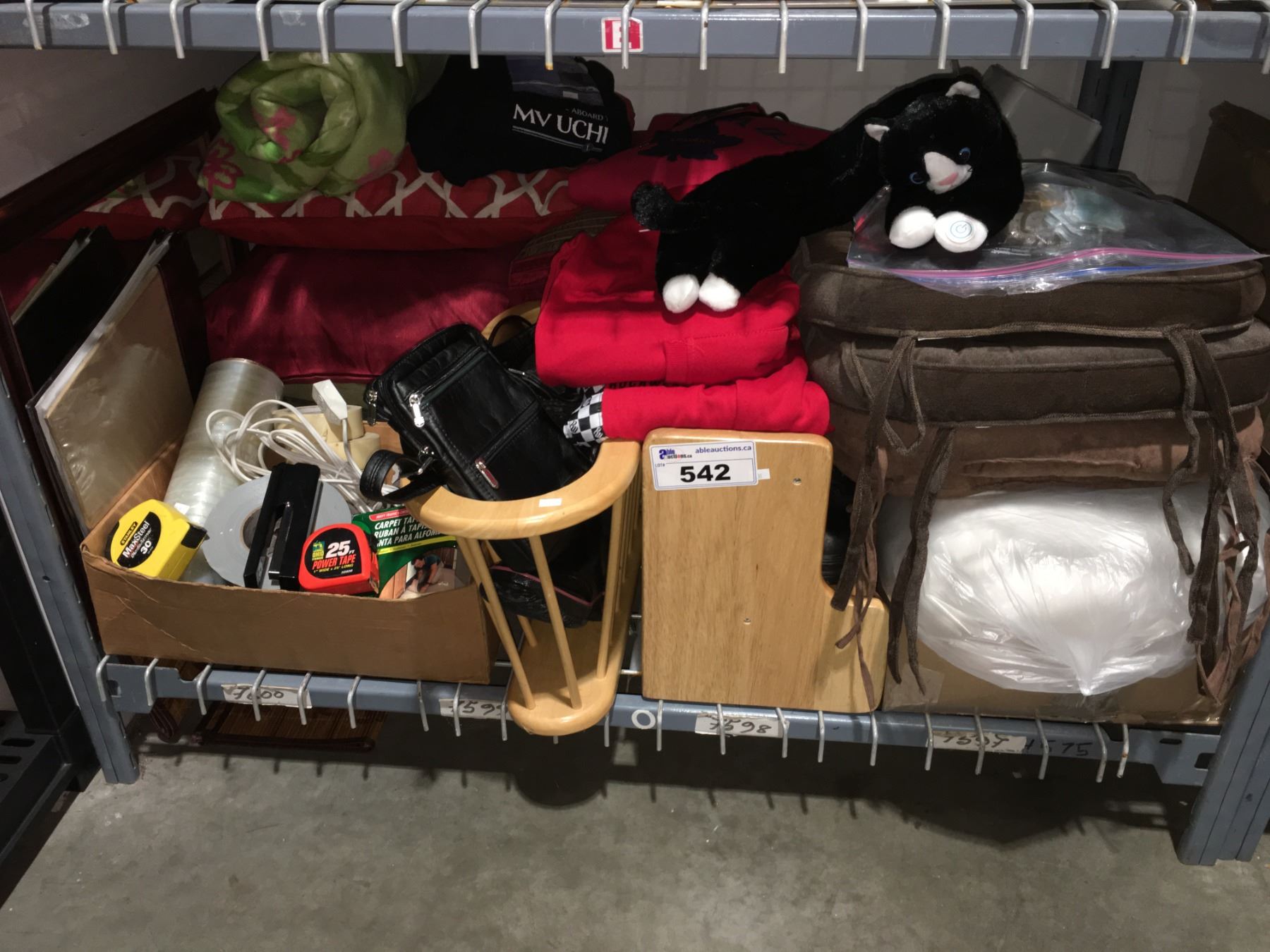 SHELF LOT FILLED WITH ASSTD HOUSEHOLD ITEMS - DECORATIVE PIECES, CUSHIONS ECT.