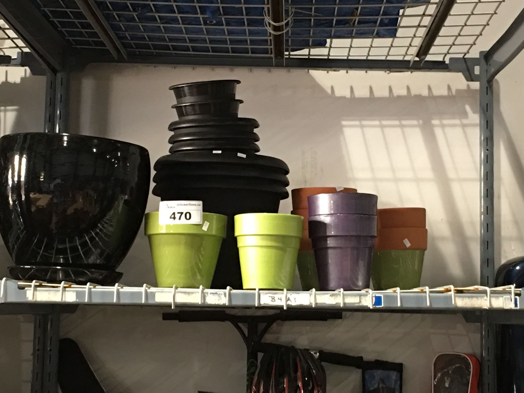 SHELF LOT FULL OF CERAMIC & PLASTIC PLANTERS