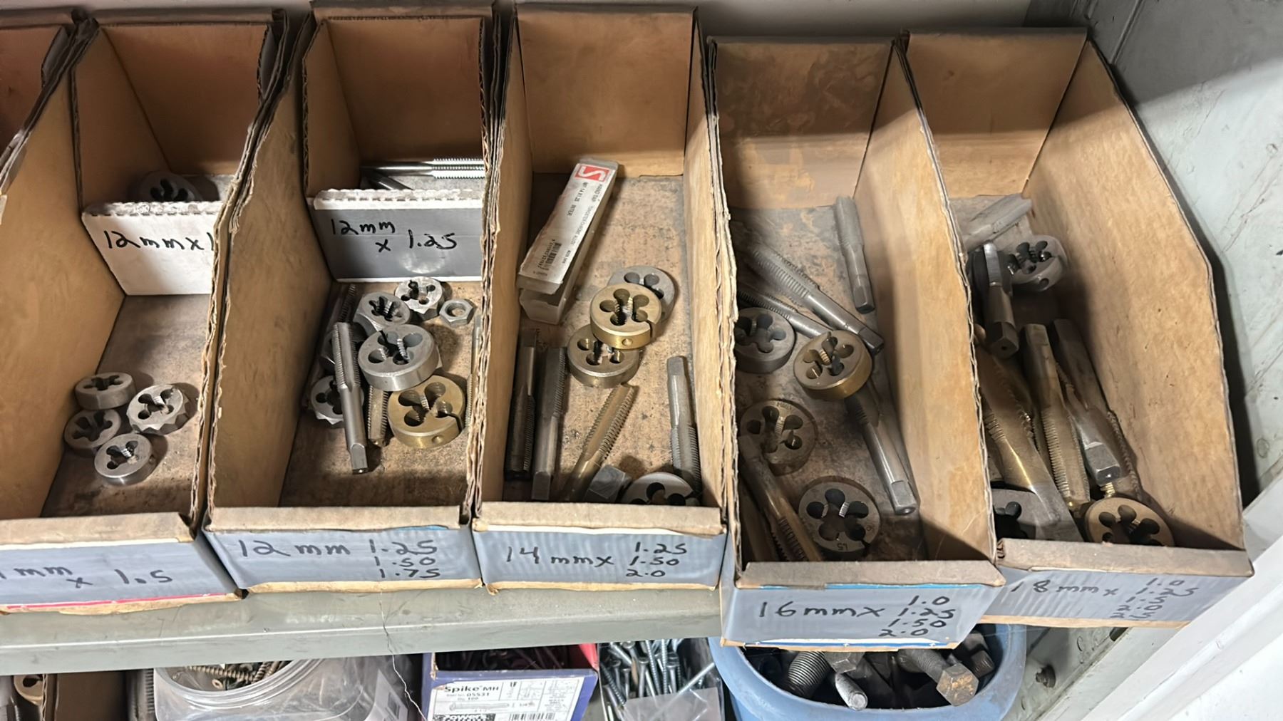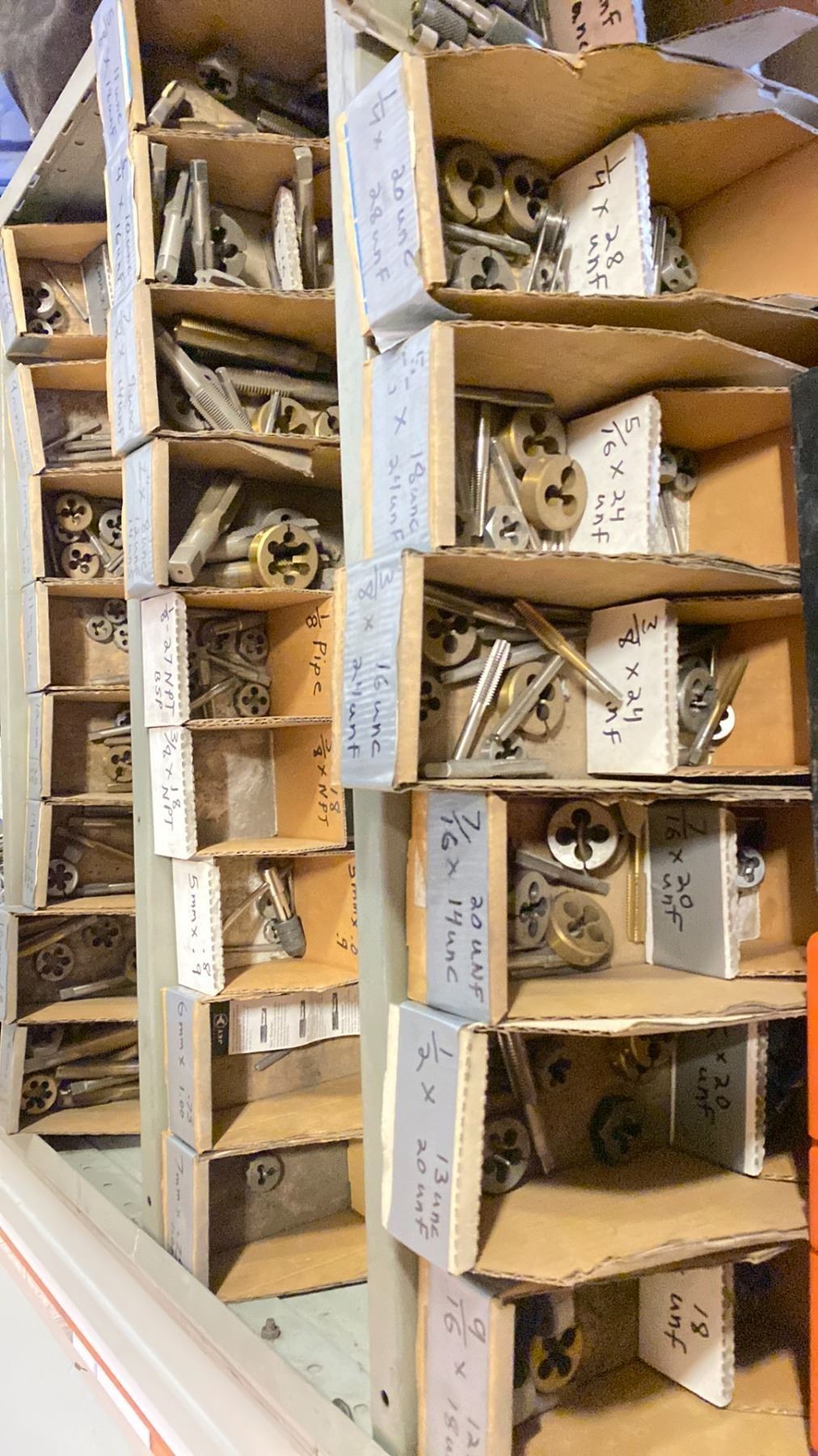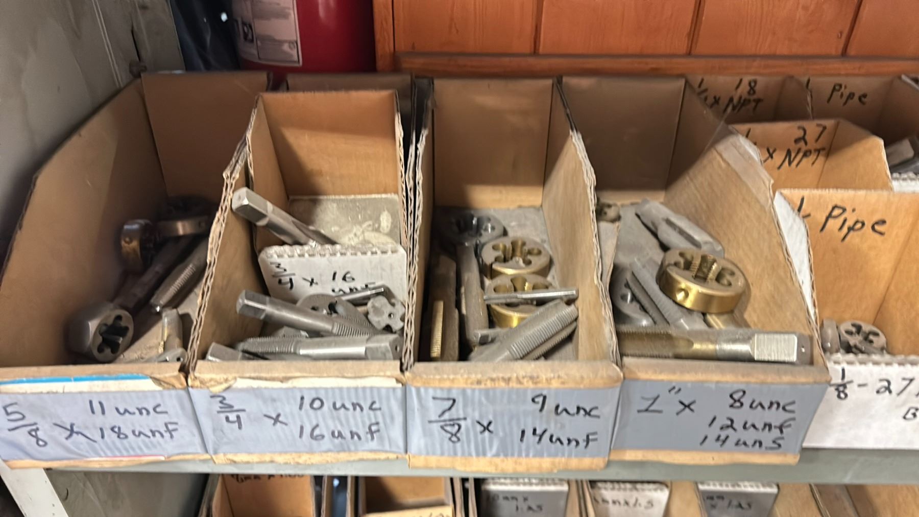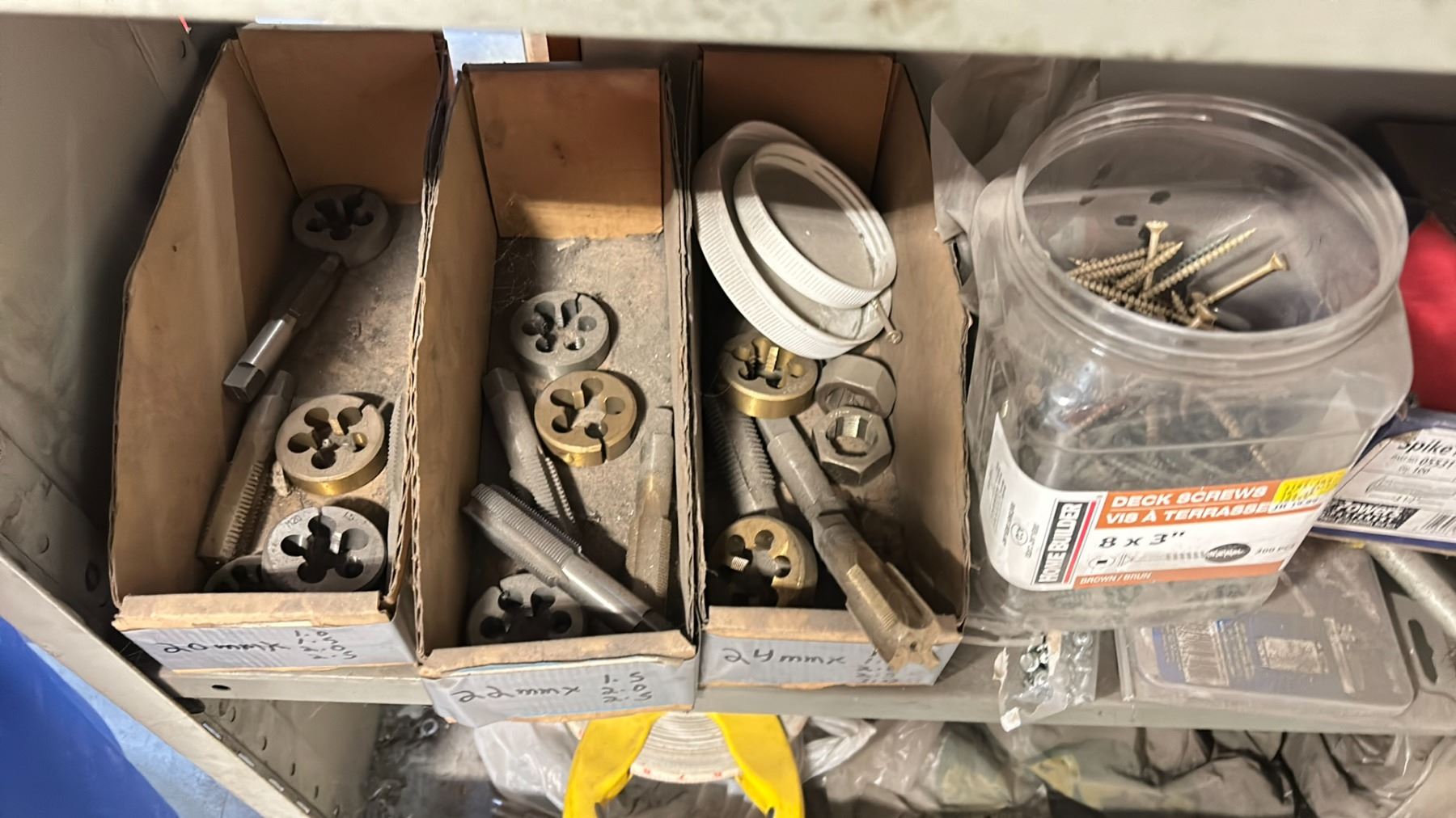 SHELF LOT INC SHELF. LARGE COLLECTION OF METRIC AND SAE TAPS AND DIES, 200' TAPE, ETC