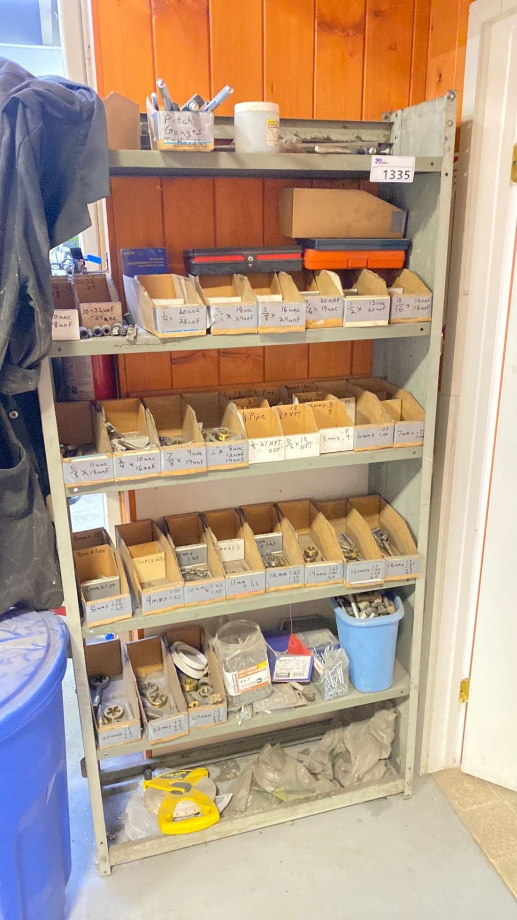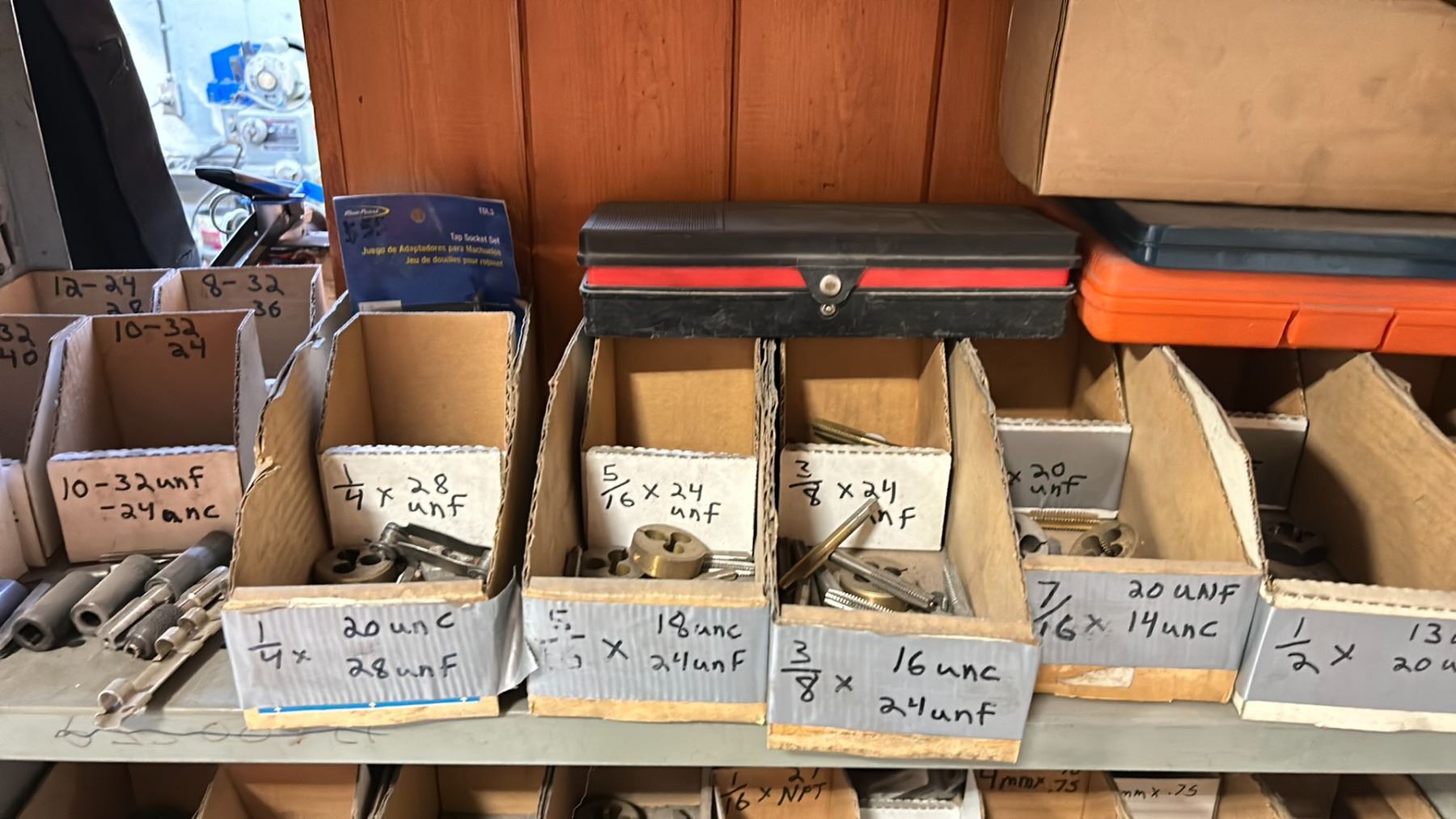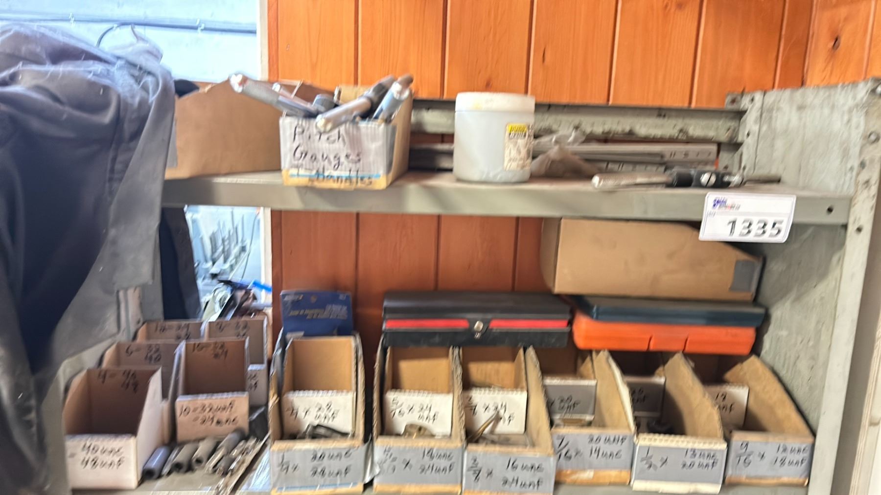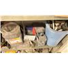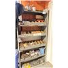 SHELF LOT INC SHELF. LARGE COLLECTION OF METRIC AND SAE TAPS AND DIES, 200' TAPE, ETC