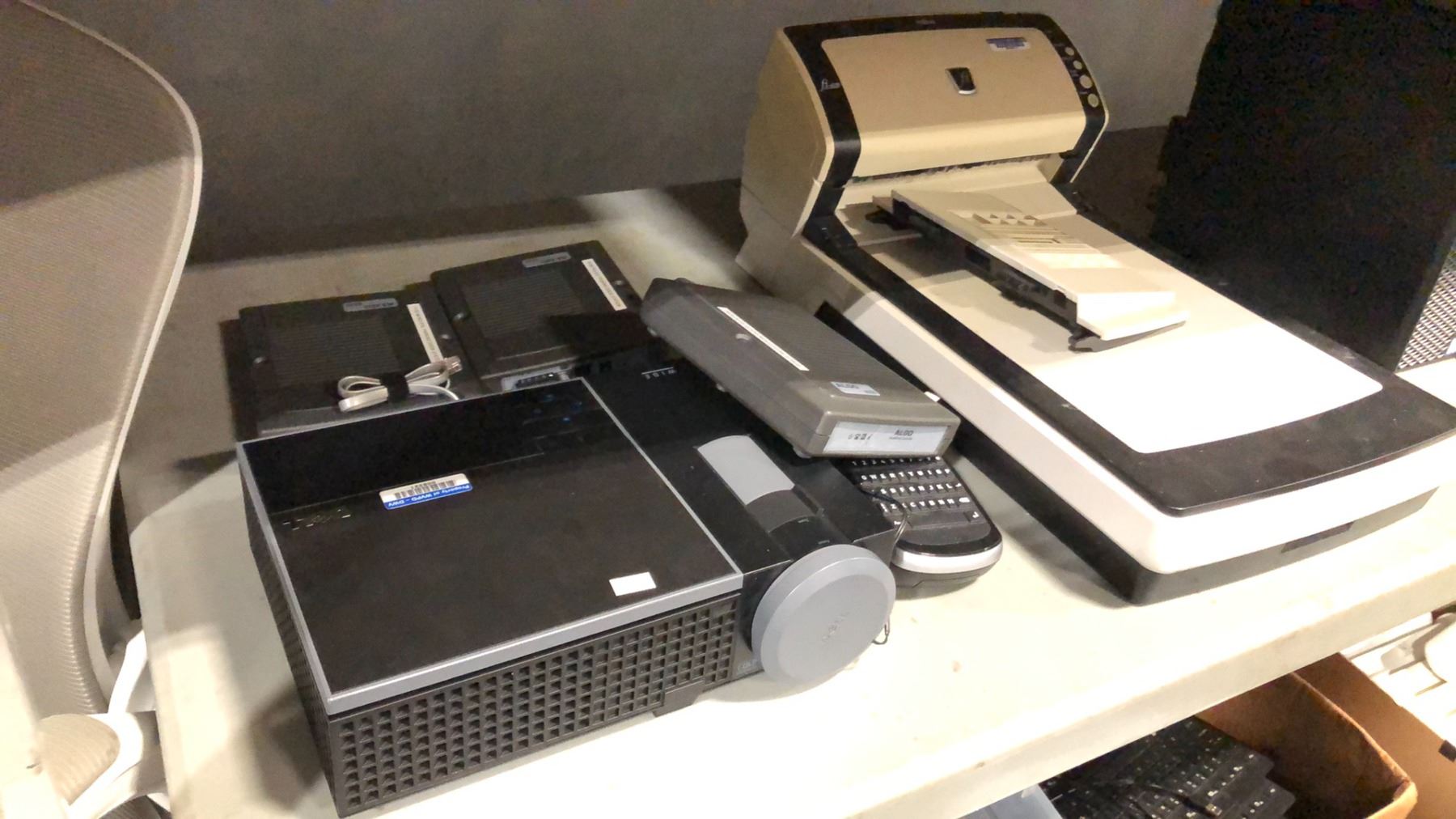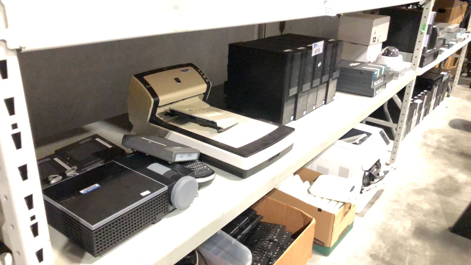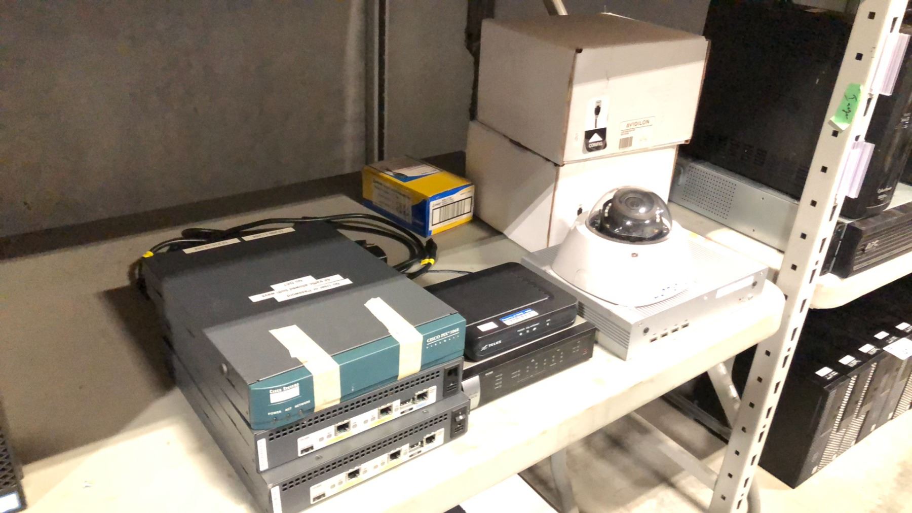 SHELF LOT INCL 5 OPTIPLEX 5070 I5 DESKTOP COMPUTERS (NO HDD) AVIGILON SECURITY DOME CAMERAS, MIXED NETWORK SWITCHES, DFI EC200-LR6881 FANLESS, INDUSTRIAL-GRADE EMBEDDED COMPUTER, DELL PROJECTOR, ALGO DOOR PHONE CONTROLLER AND FUJITSU FI-230 SCANNER