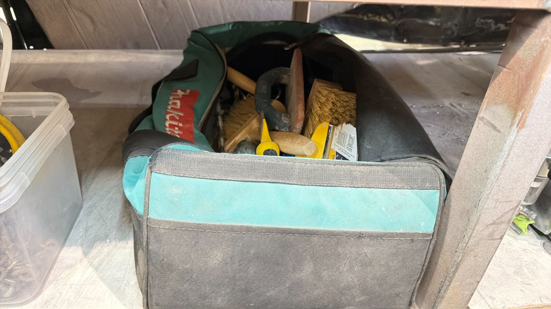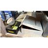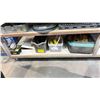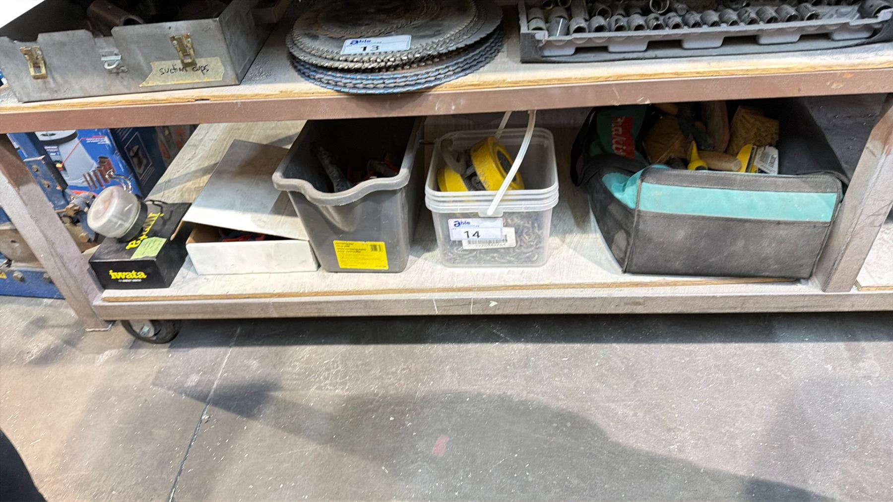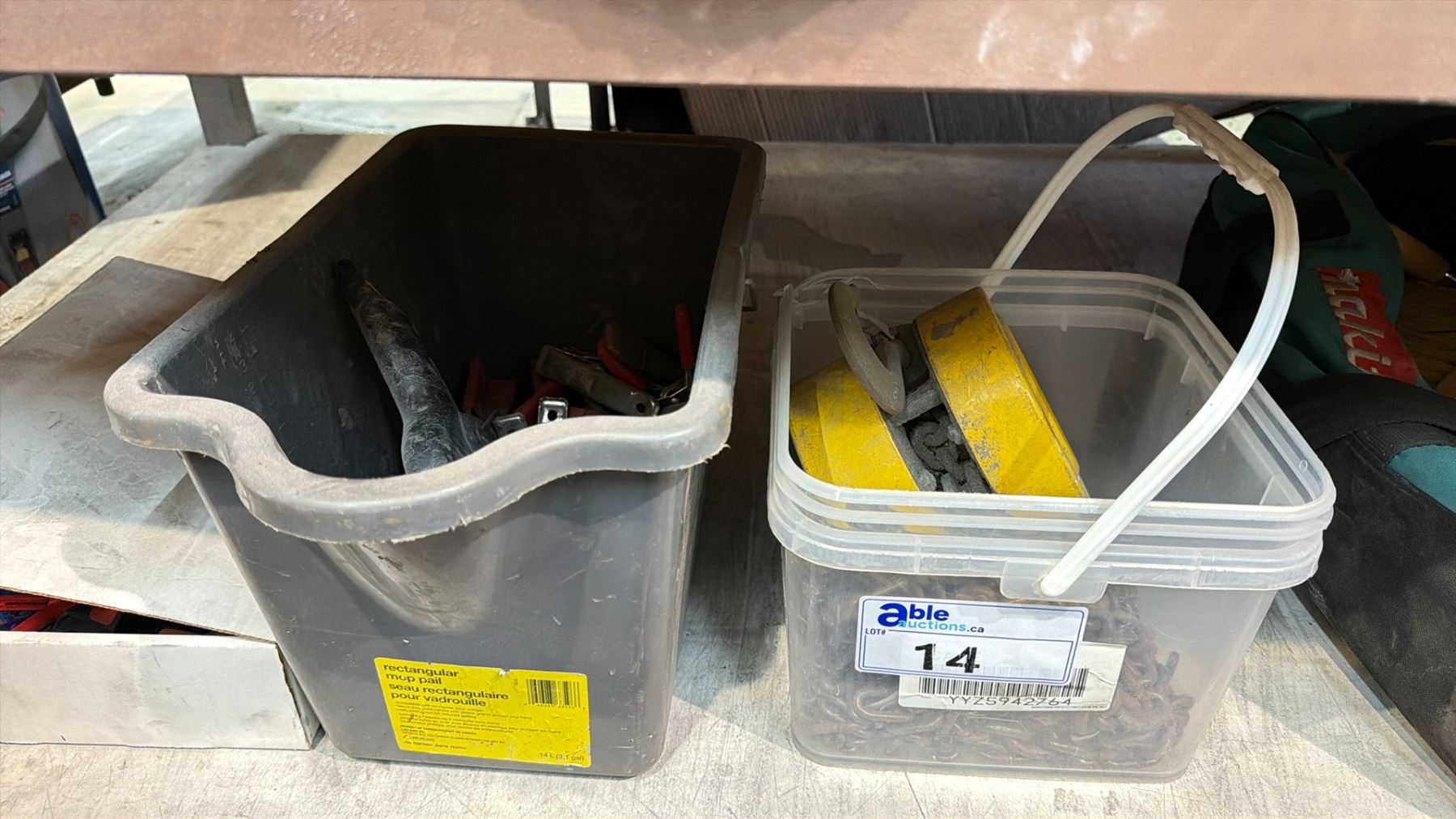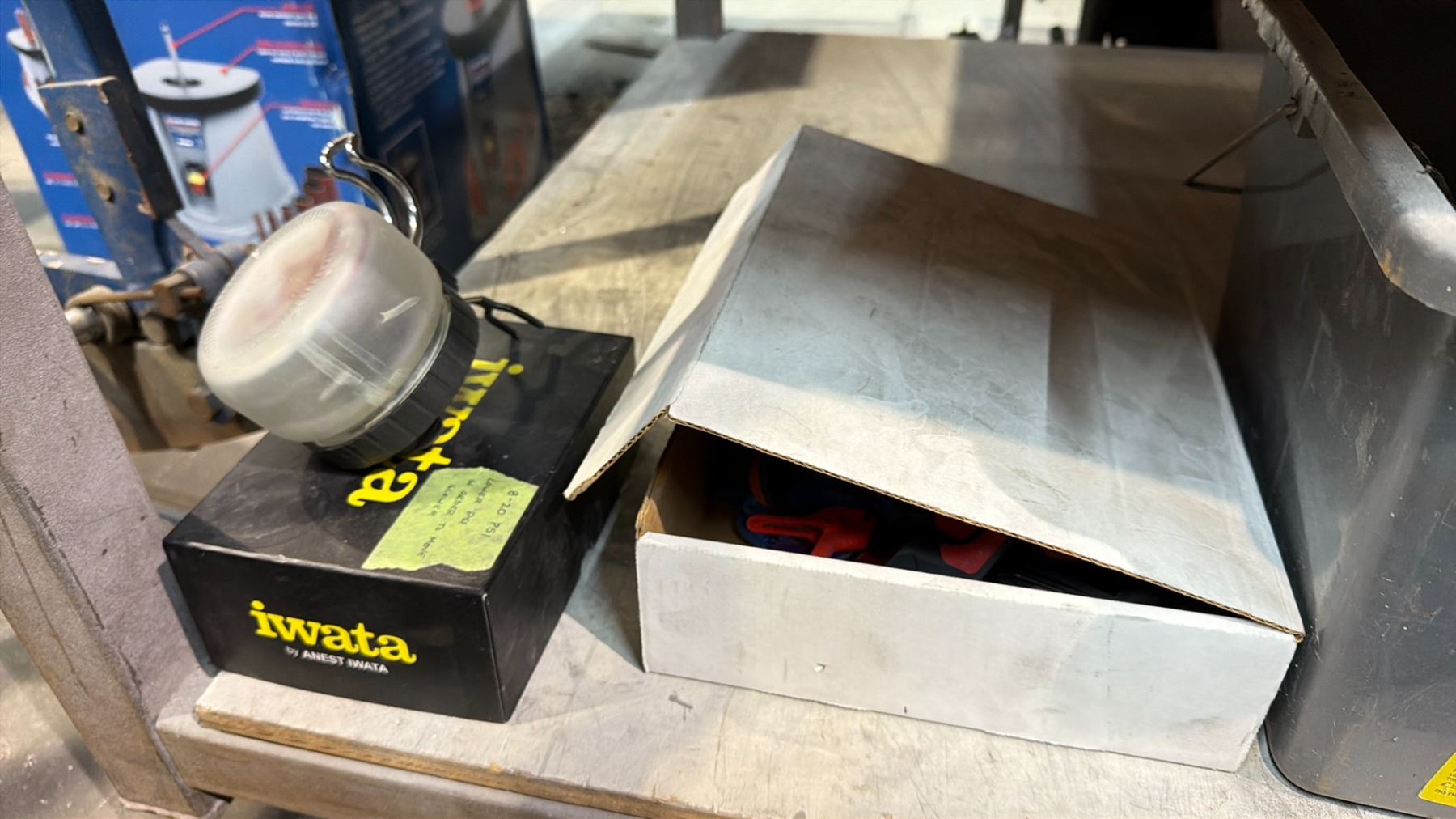 SHELF LOT INCLUDING 1 TON CHAIN HOIST, CLAMPS, PAINTING SUPPLIES AND MORE