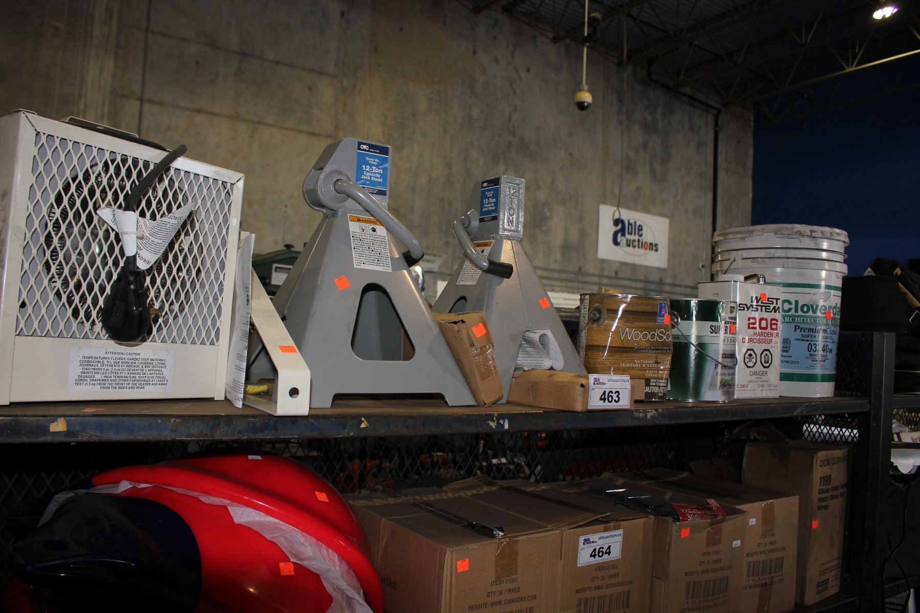 SHELF LOT INCLUDING 2 12 TON JACK STANDS, SMALL SHOP HEATER, STAIN, ACRYLIC LATEX PAINT AND MORE