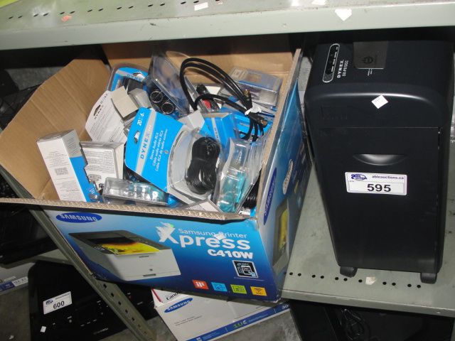SHELF LOT INCLUDING A PAPER CUTTER AND BOX OF MISC DYNEX AND OTHER ELECTRONIC ACCESORIES