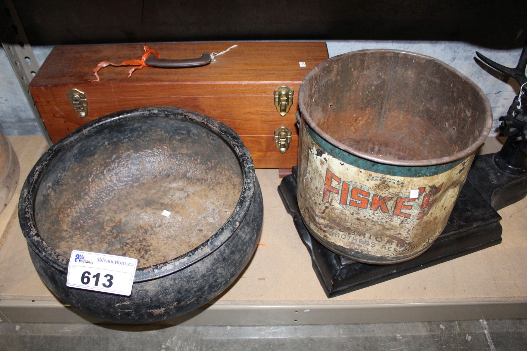 SHELF LOT INCLUDING ANTIQUE SCALE, WOODEN CHEST, GALVANIZED BOWL AND MORE