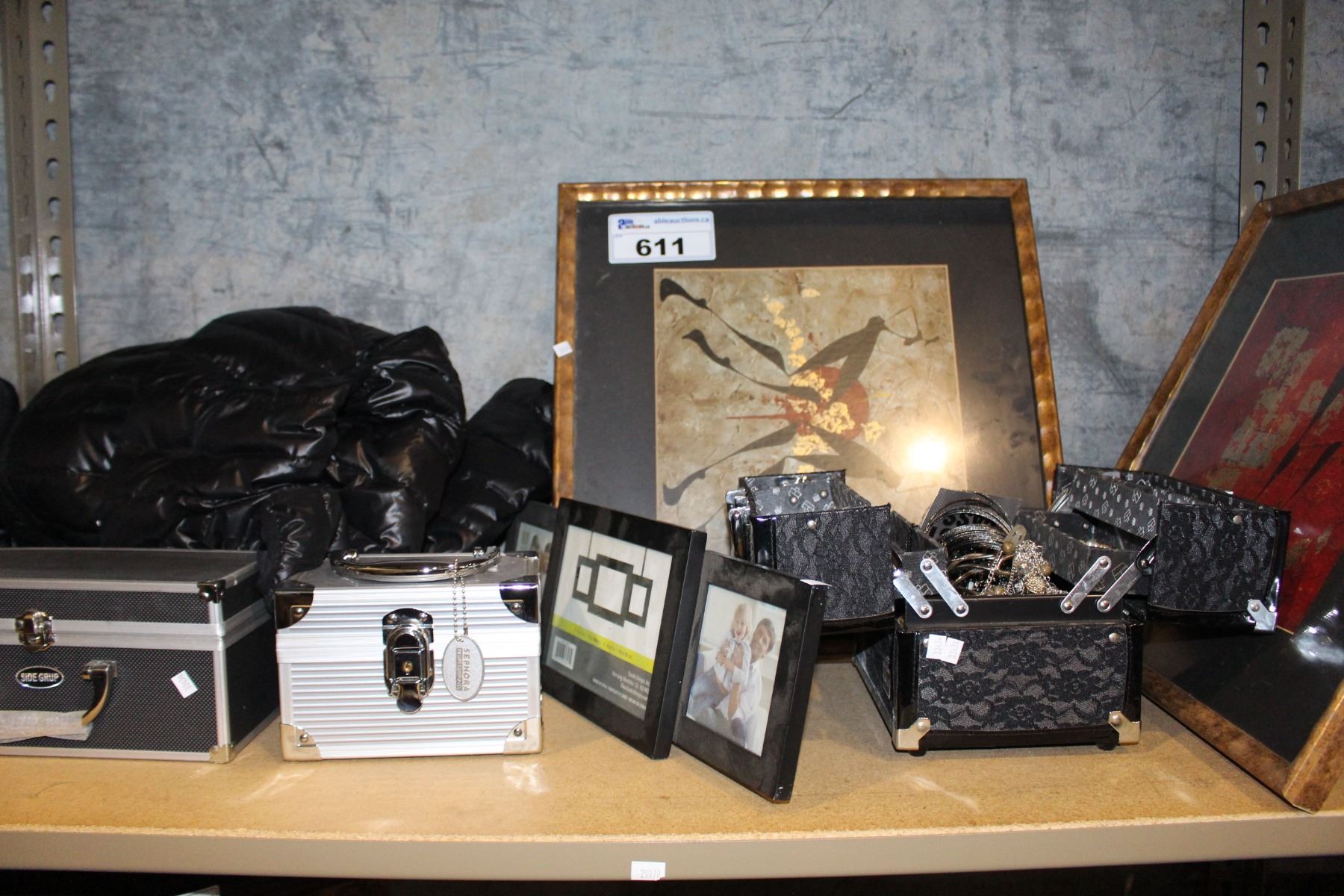 SHELF LOT INCLUDING ART, WINTER JACKET, COSTUME JEWELLERY AND MORE