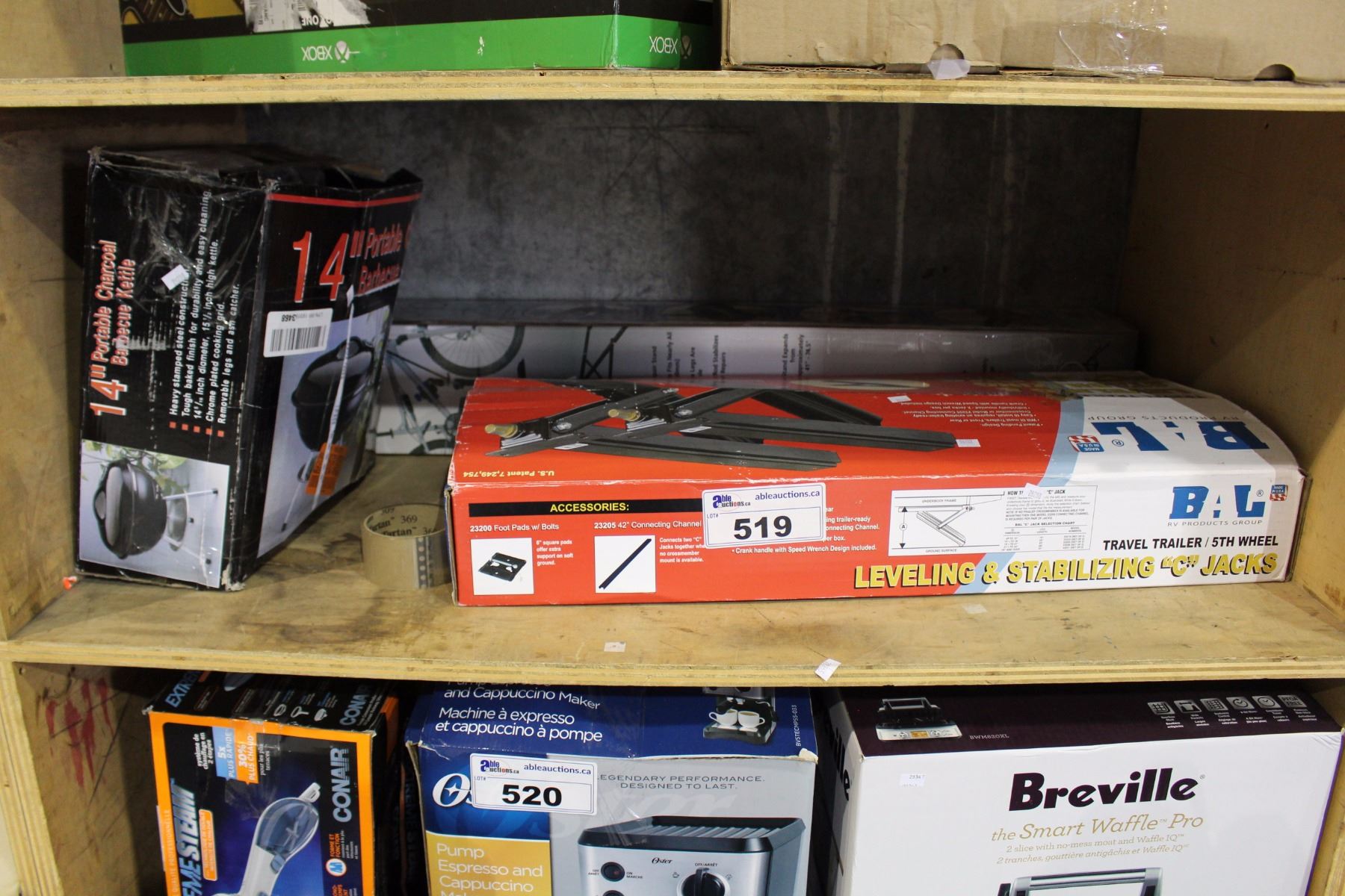 SHELF LOT INCLUDING BBQ, STABILIZING JACKS, AND BIKE RACK