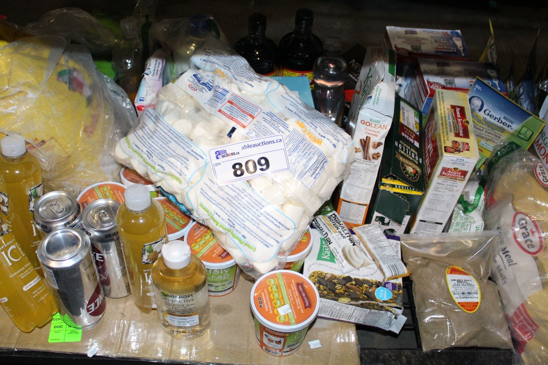 SHELF LOT INCLUDING CEREAL, LAUNDRY DETERGENT, DISHWASHER SOAP, PROTEIN BARS, CHOCOLATES AND
