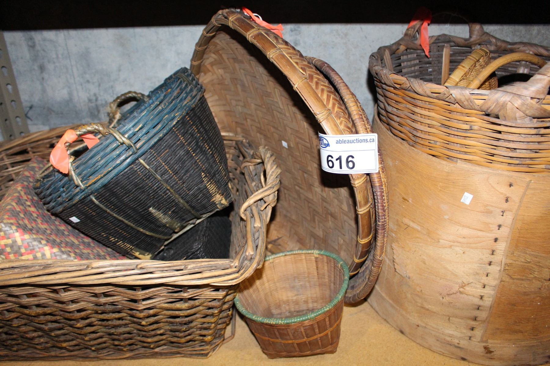SHELF LOT INCLUDING CHEESE BARREL, WICKER BASKETS AND HAMPERS