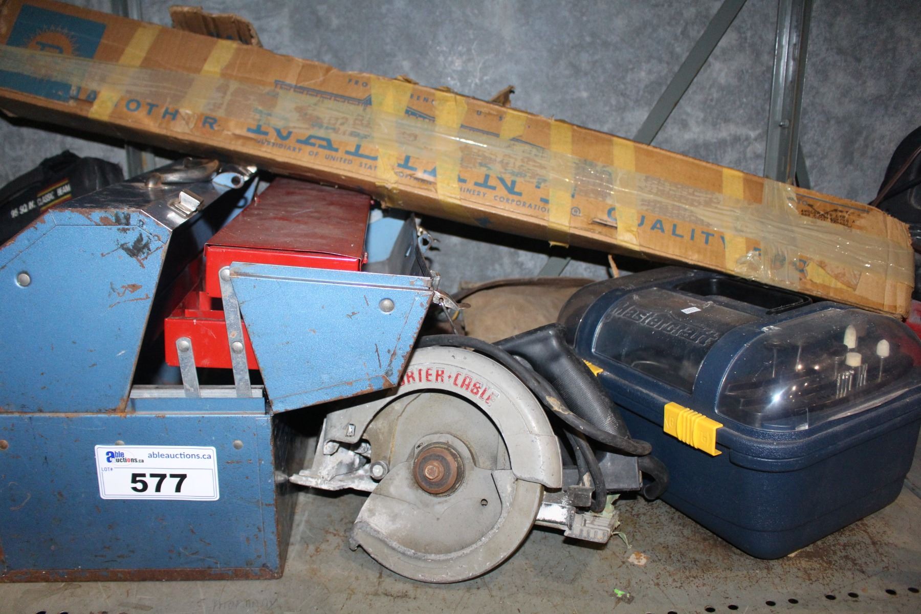 SHELF LOT INCLUDING CIRCULAR SAW, TWO TOOL BOXES, SCREEN FOR PROJECTOR AND MORE