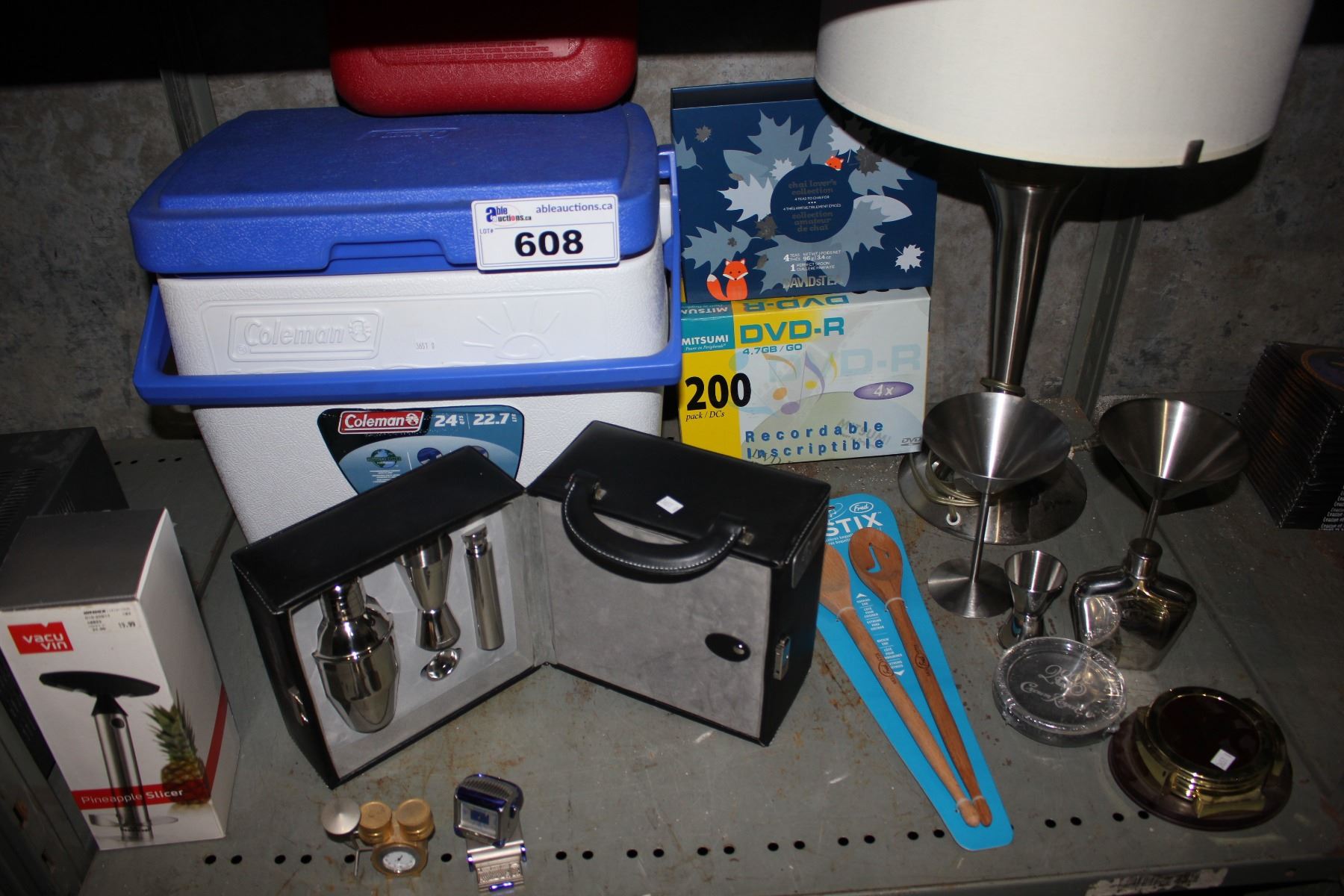 SHELF LOT INCLUDING COLEMAN COOLER, MIXOLOGY SETS, PINEAPPLE CORER, TWO NOVELTY CLOCKS, DAVIDS TEA SET AND MORE
