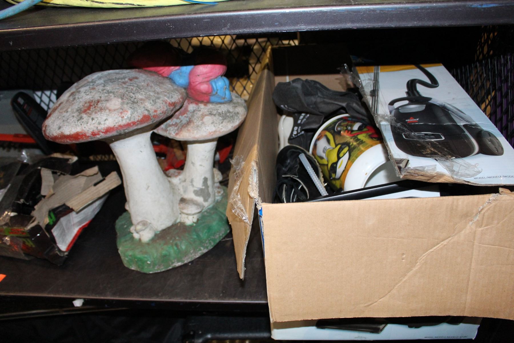 SHELF LOT INCLUDING CONCRETE MUSHROOM AND OTHER GOODS