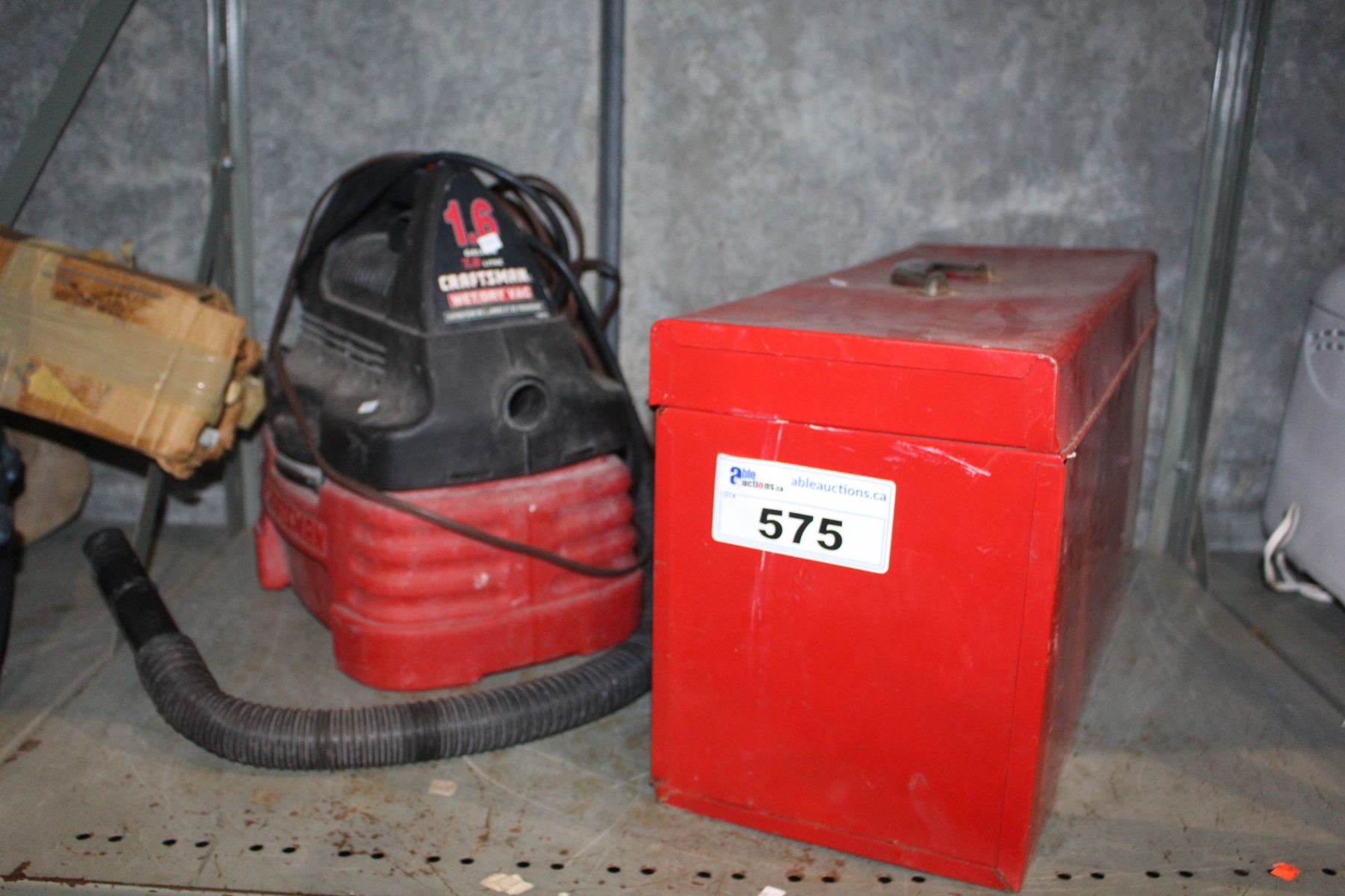SHELF LOT INCLUDING CRAFTSMAN VACUUM AND TOOLBOX