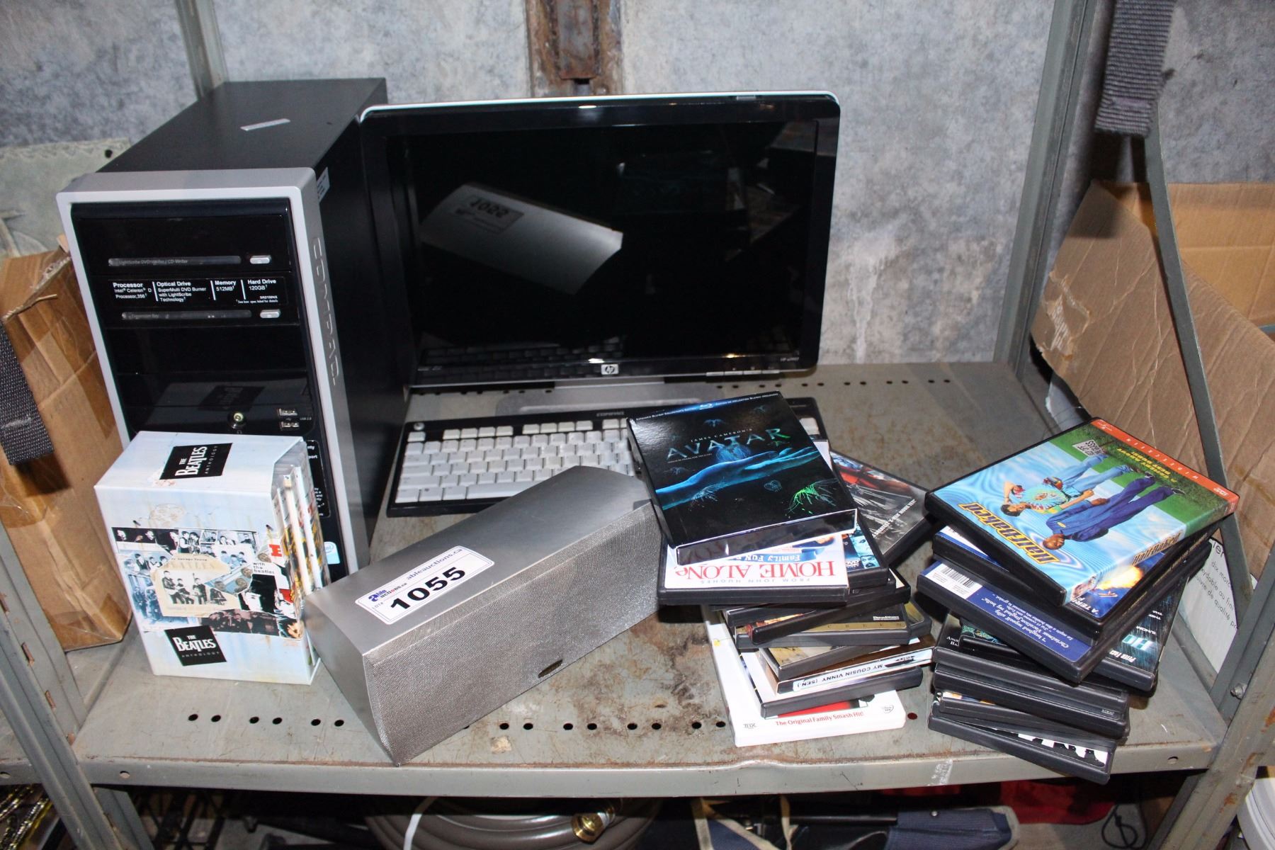 SHELF LOT INCLUDING DESKTOP COMPUTER DVDS AND MORE