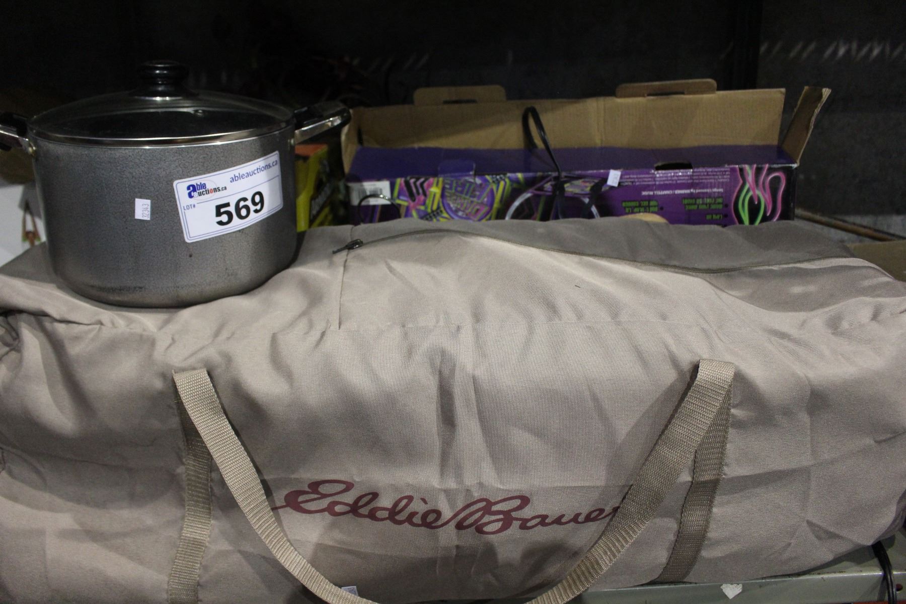 SHELF LOT INCLUDING EDDIE BAUER PLAY PEN, MISC DISHES AND OTHER HOUSEHOLD GOODS