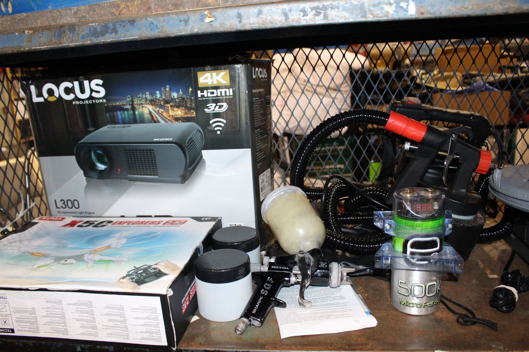 SHELF LOT INCLUDING ELECTRONICS, PROJECTOR, DRONE AND MORE