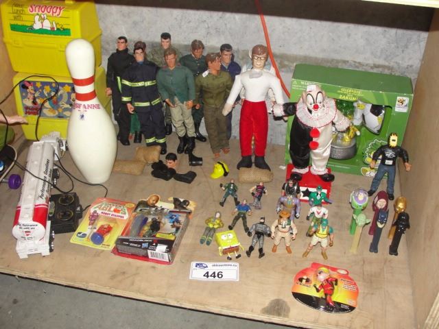 SHELF LOT INCLUDING; GI TOYS, DOLLS, TONY HAWK SKATEBOARDING TOY AND OTHER ITEMS
