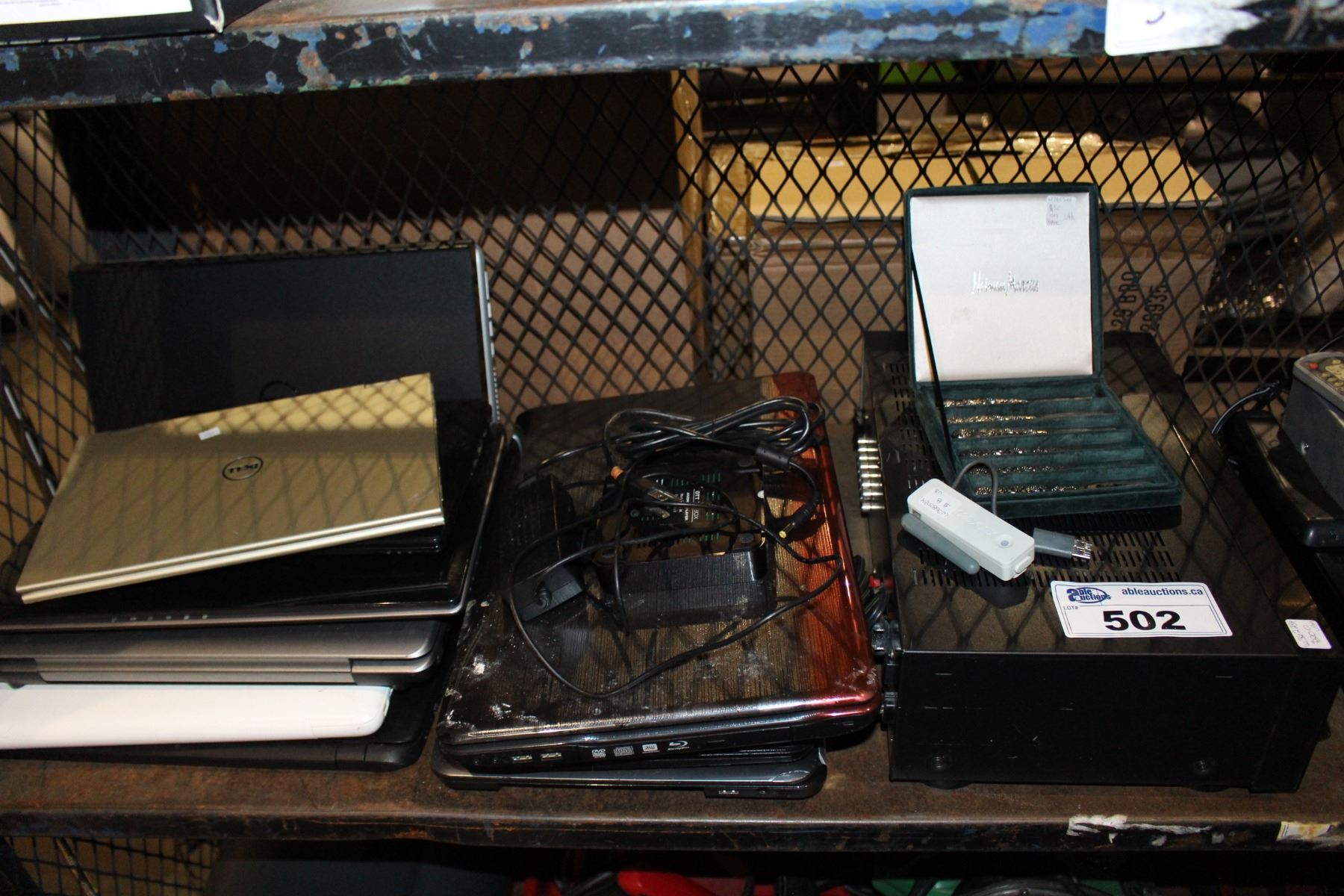 SHELF LOT INCLUDING LAPTOPS, RECEIVER AND MORE