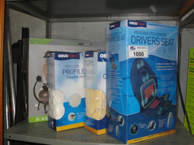 SHELF LOT INCLUDING; MASSAGE CUSHION, 2 PILLOWS AND CHAISEBALLON