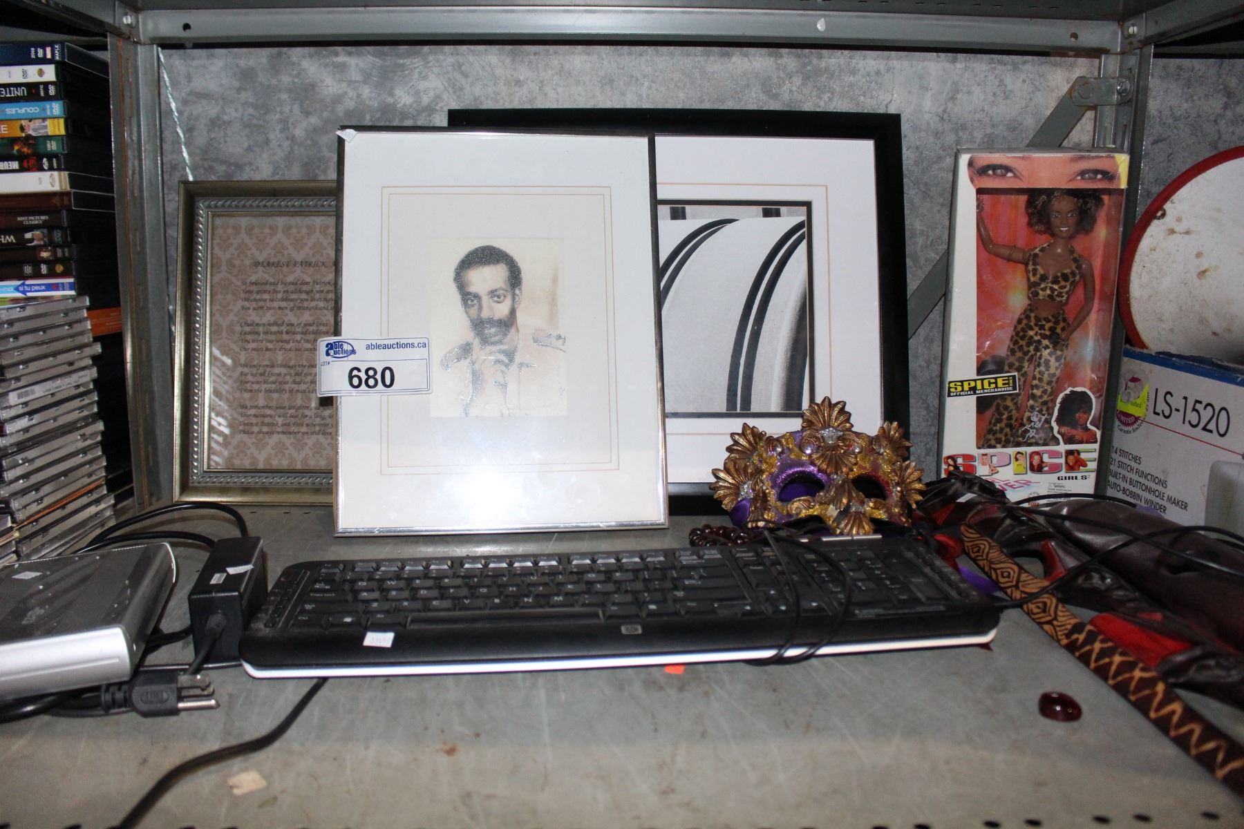 SHELF LOT INCLUDING MISC ARTWORK, KEYBOARD, DOLL AND MORE