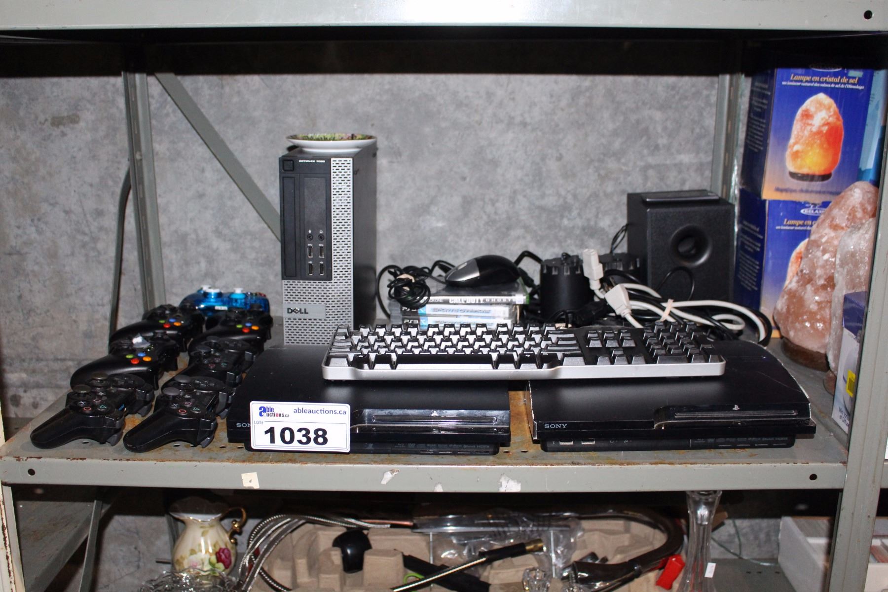 SHELF LOT INCLUDING PLAYSTATION CONTROLLERS AND DELL PC AND PLAYSTATION GAMES