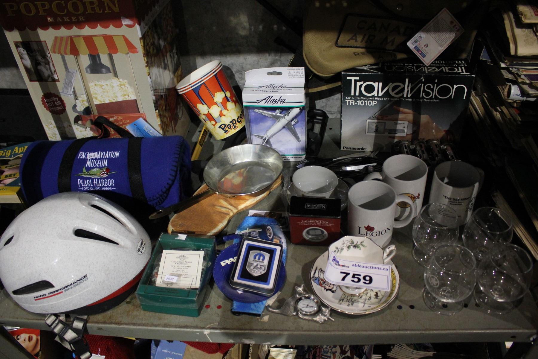 SHELF LOT INCLUDING POPCORN MAKER, BLANKET, HELMET, MUGS/CUPS AND MORE