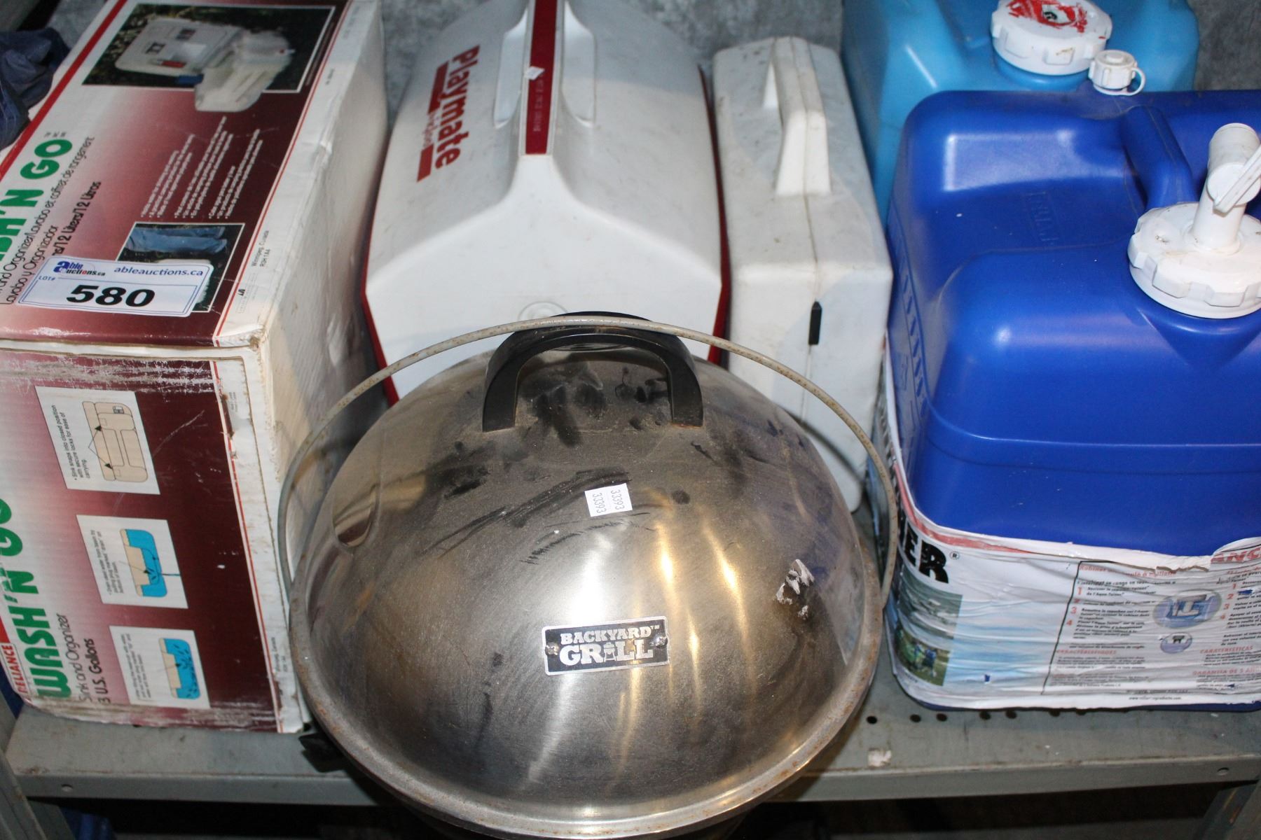 SHELF LOT INCLUDING PORTABLE SINK, LUNCHBOX, BACKYARD GRILL, WATER JUGS AND MORE