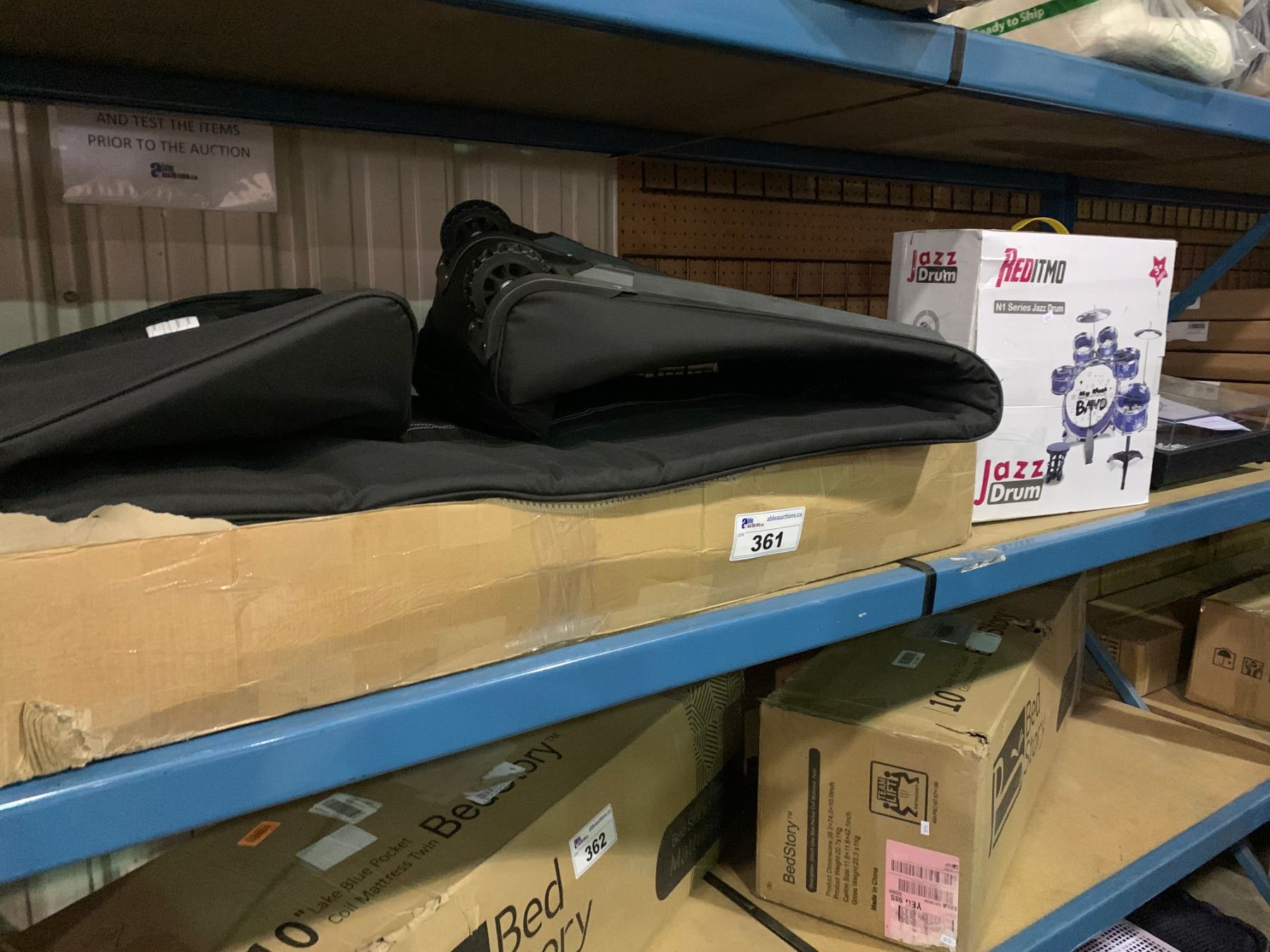 SHELF LOT INCLUDING ; REDITMO N1 SERIES JAZZ DRUM, VINTAGE TURNTABLE MODEL VMO-008, MOBILE SOFT COVER CASE & WOOD SHELF PARTS