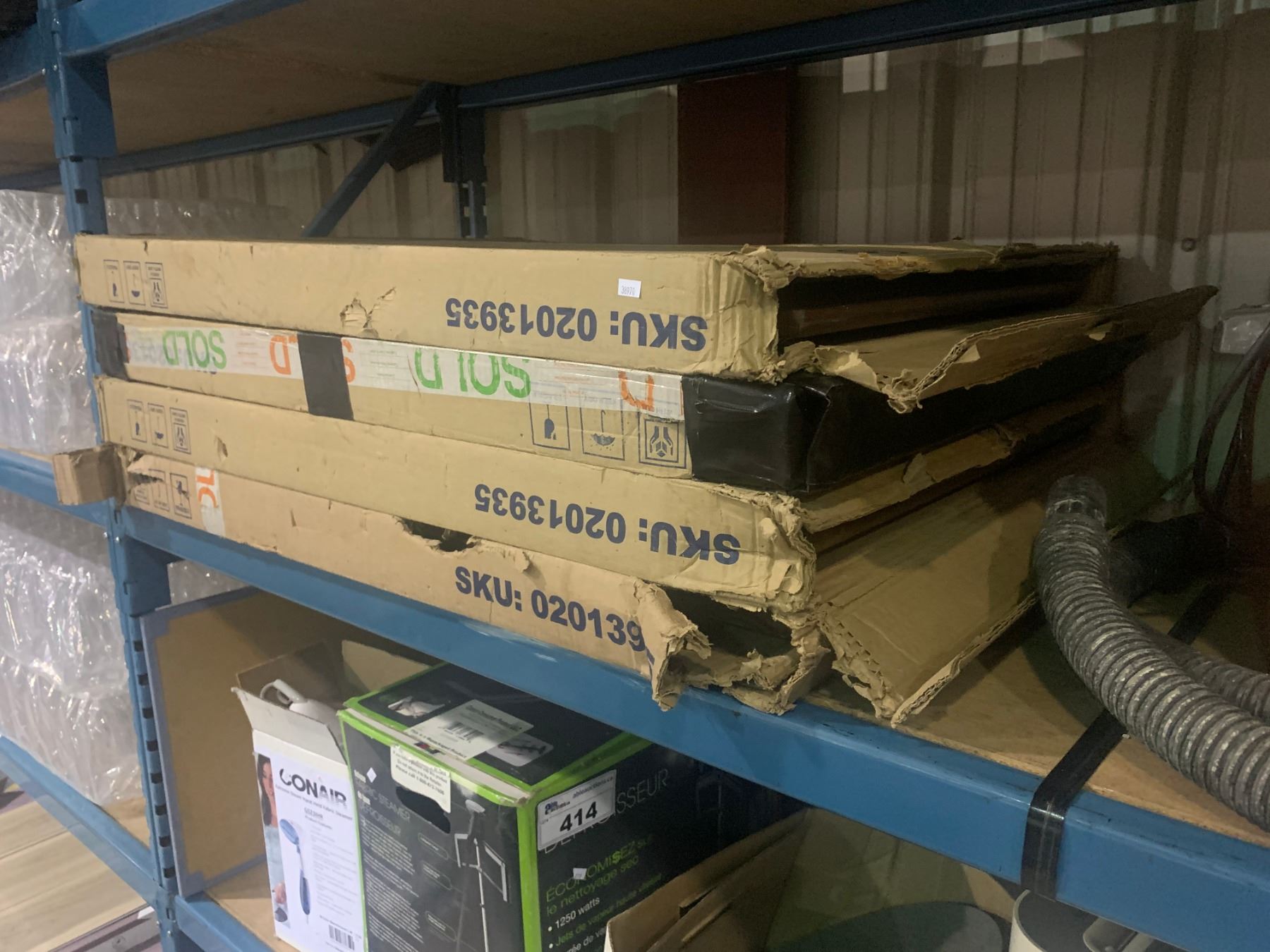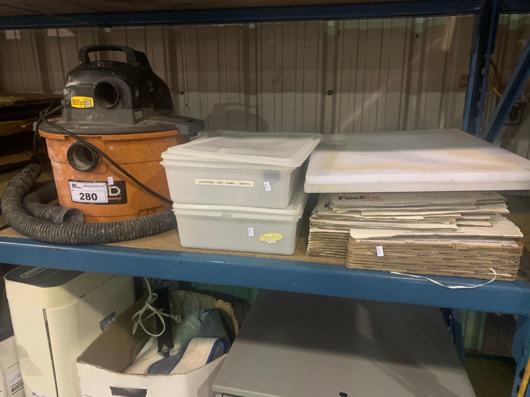 SHELF LOT INCLUDING ; RIGID WET/DRY SHOP VAC, CUTTING BOARDS, SHIPPING BOXES & 4 BOXES OF PIER 1 SHELVING UNITS