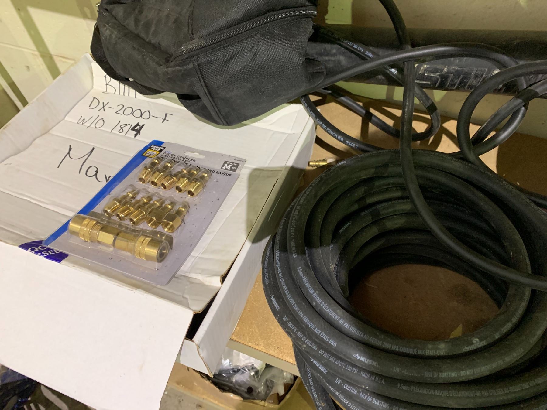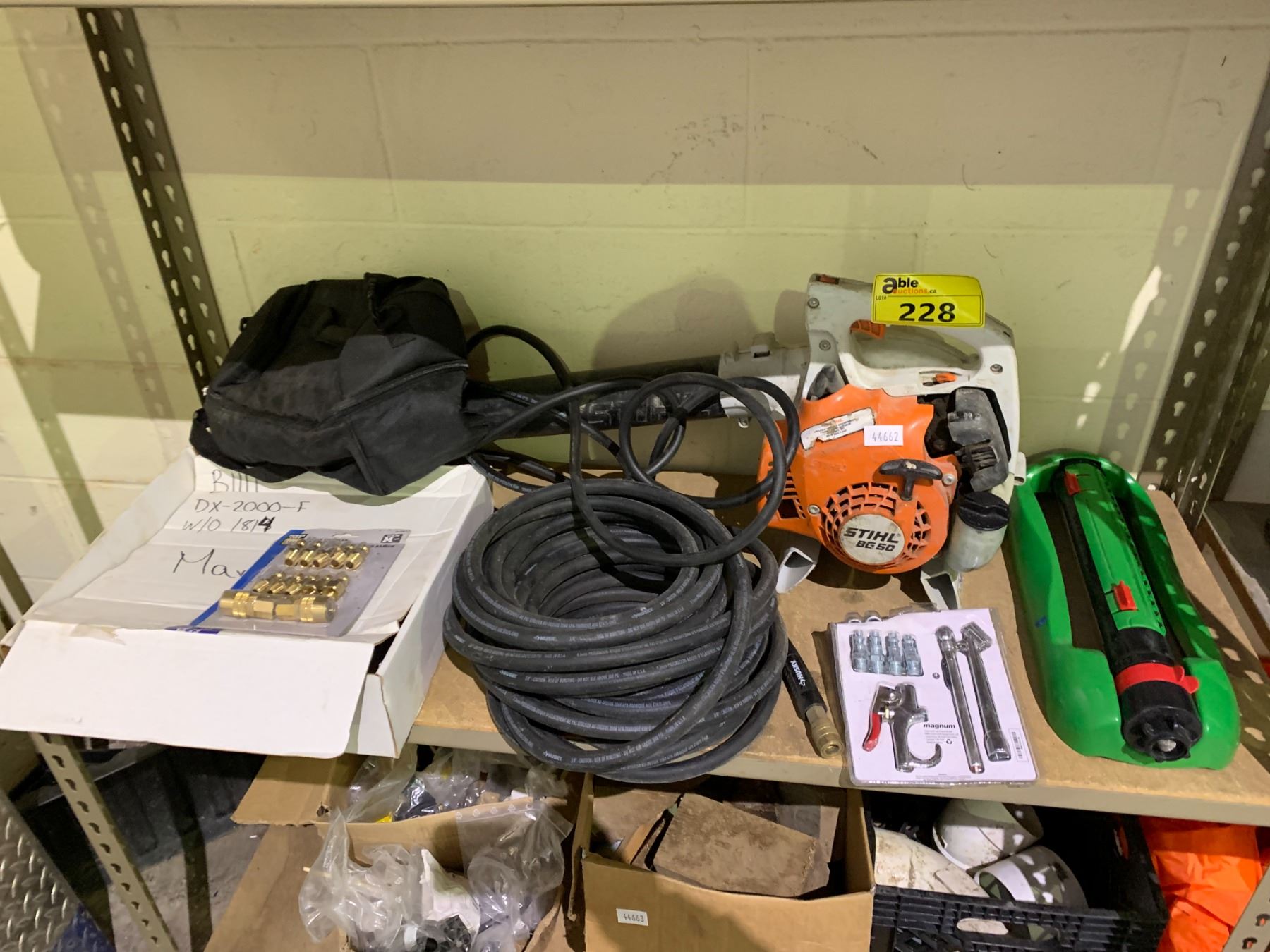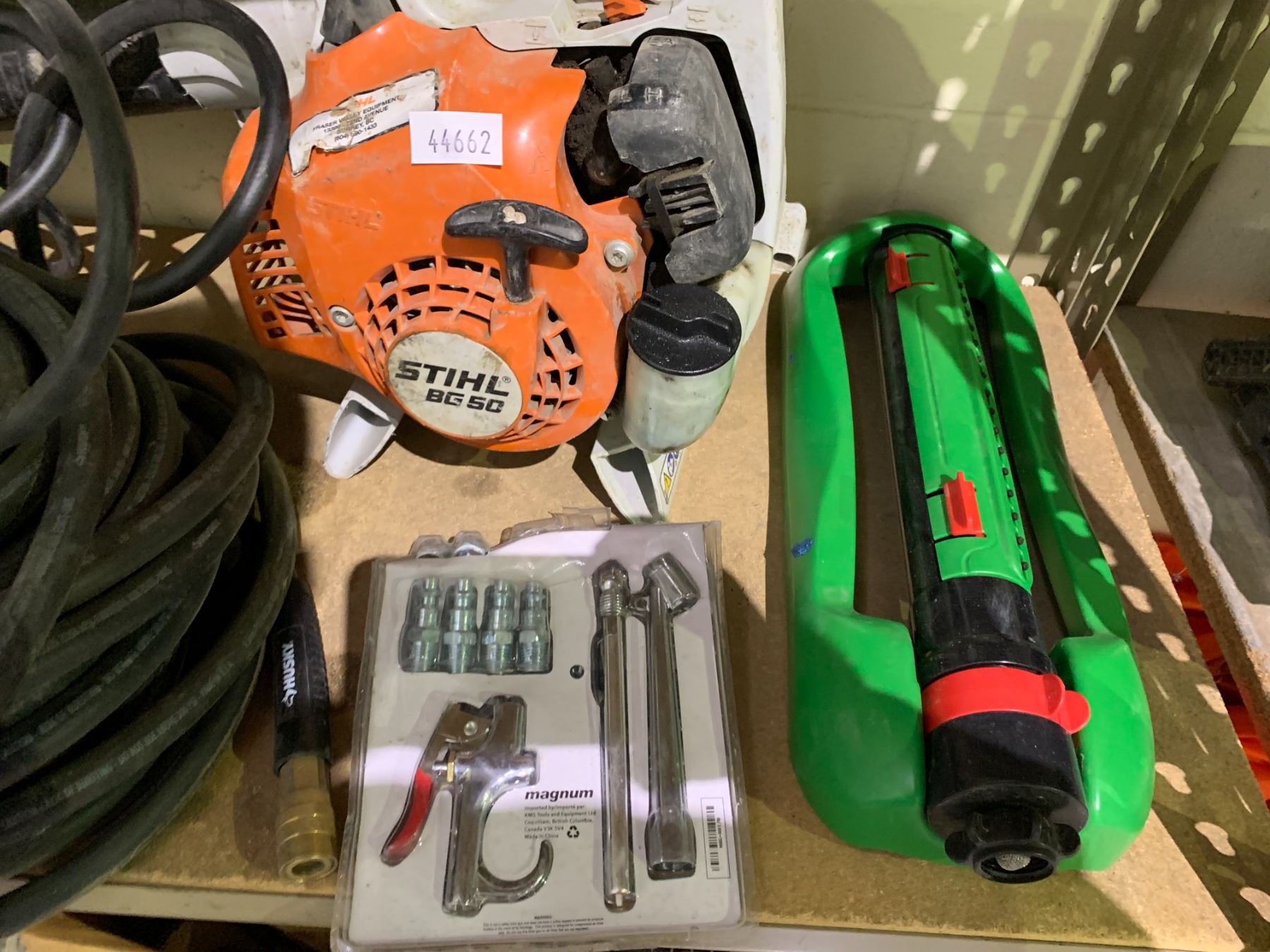SHELF LOT INCLUDING; STIHL BLOWER, AIR HOSE, SPRINKLER AND MORE