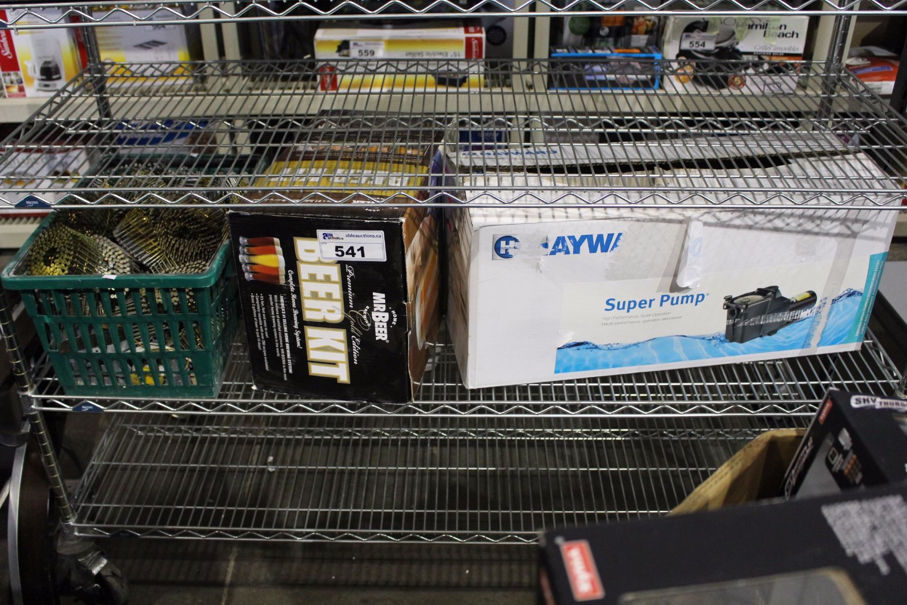 SHELF LOT INCLUDING SUPER PUMP, BEER KIT, AND NAILS