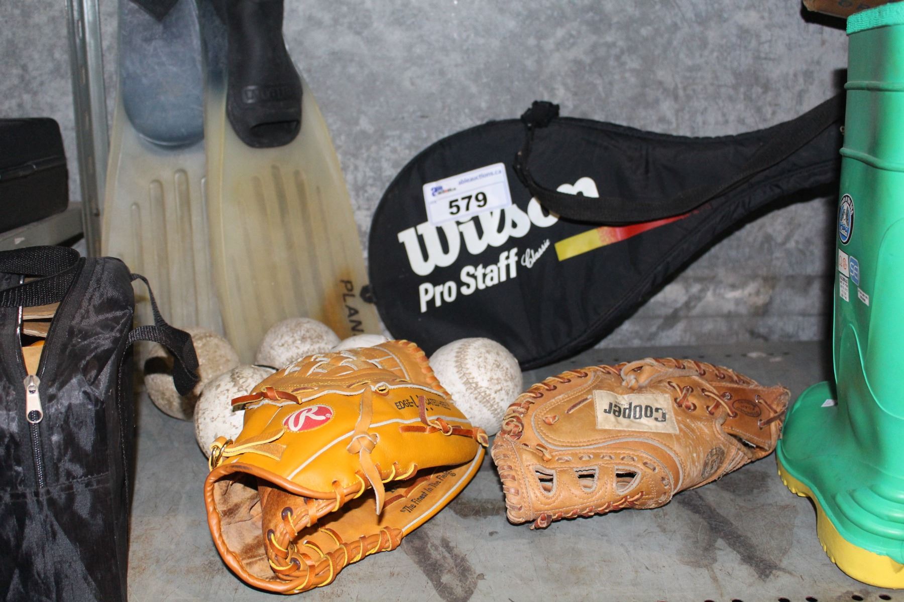 SHELF LOT INCLUDING TENNIS RACKETS, TWO BALL GLOVES, SOFT BALLS, FLIPPERS AND MORE