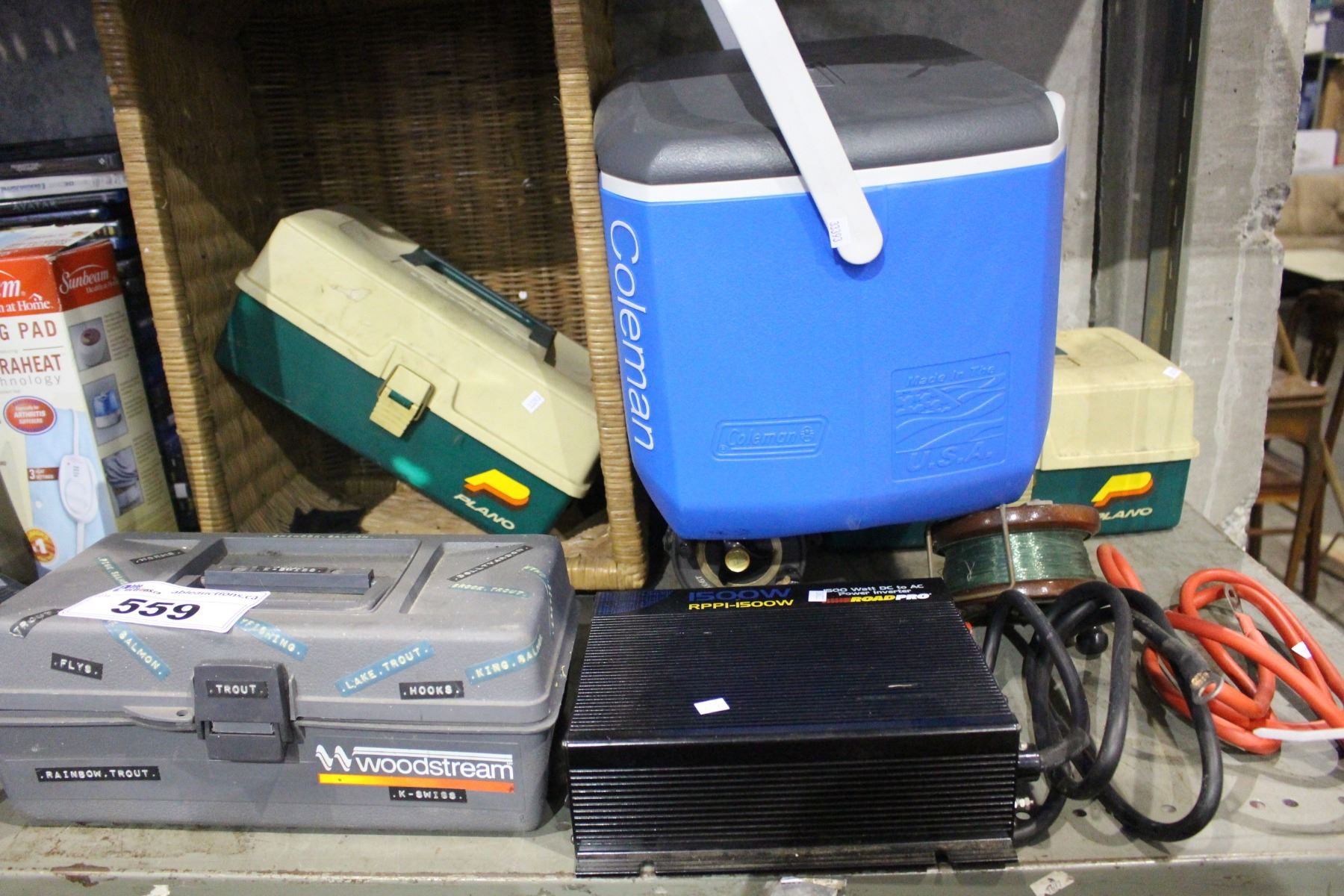 SHELF LOT INCLUDING THREE TACKLE BOXES, 1500 WATT DC TO AC POWER INVERTER AND MISC FISHING GEAR