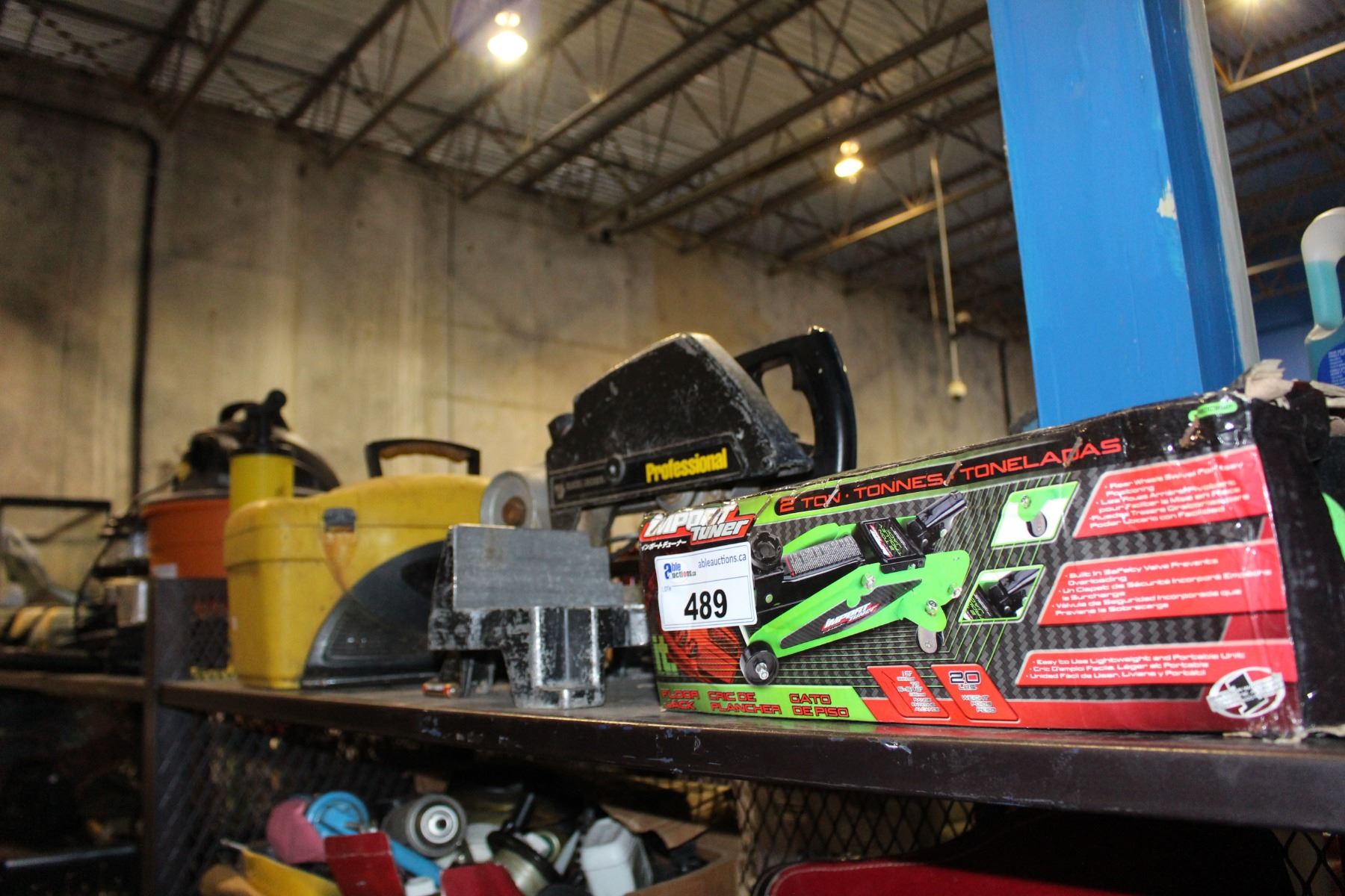 SHELF LOT INCLUDING TOOL BOX, FLOOR JACK IN CARTON AND MORE