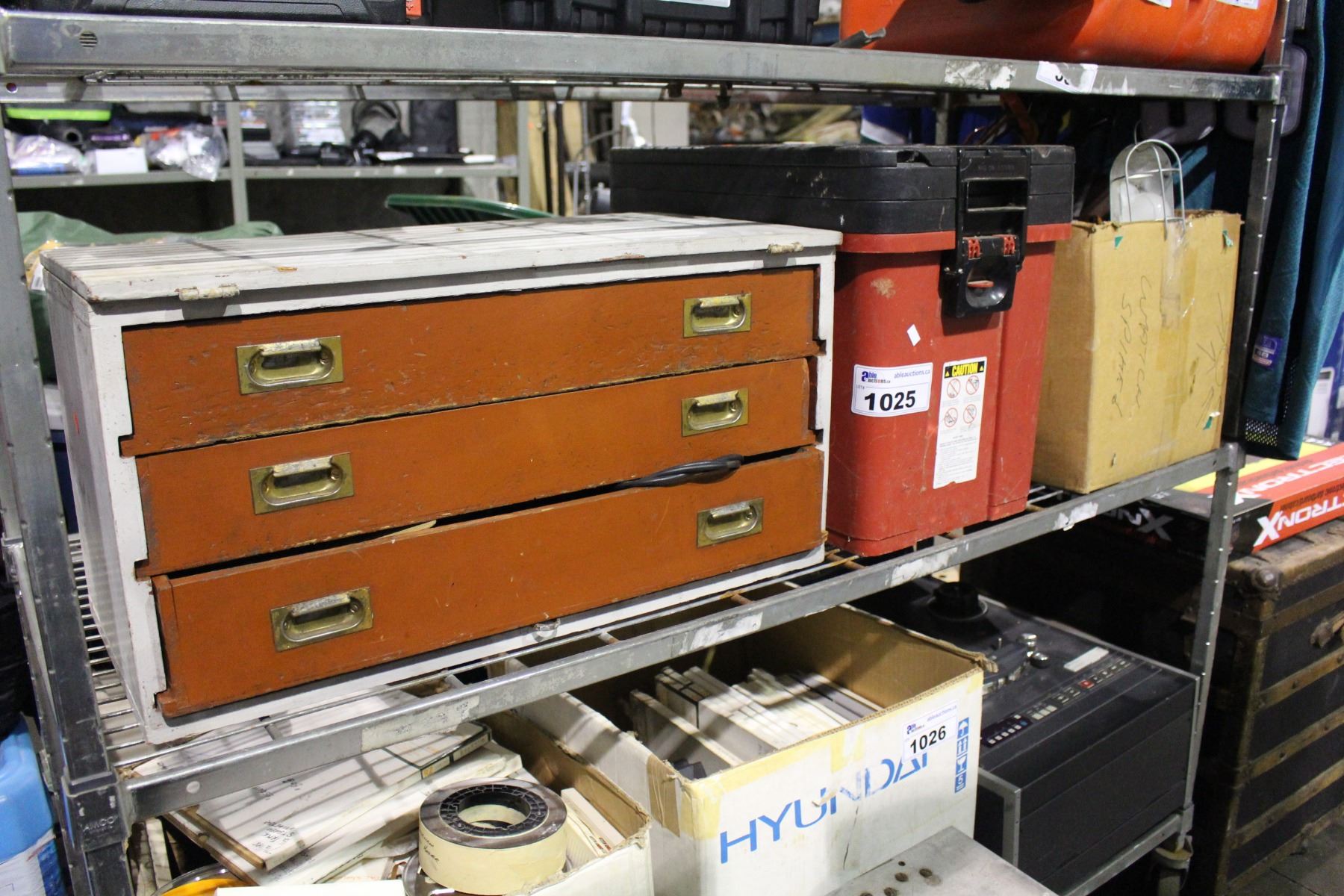 SHELF LOT INCLUDING TOOLBOX WITH TOOLS AND BOX OF MISC TOOLS